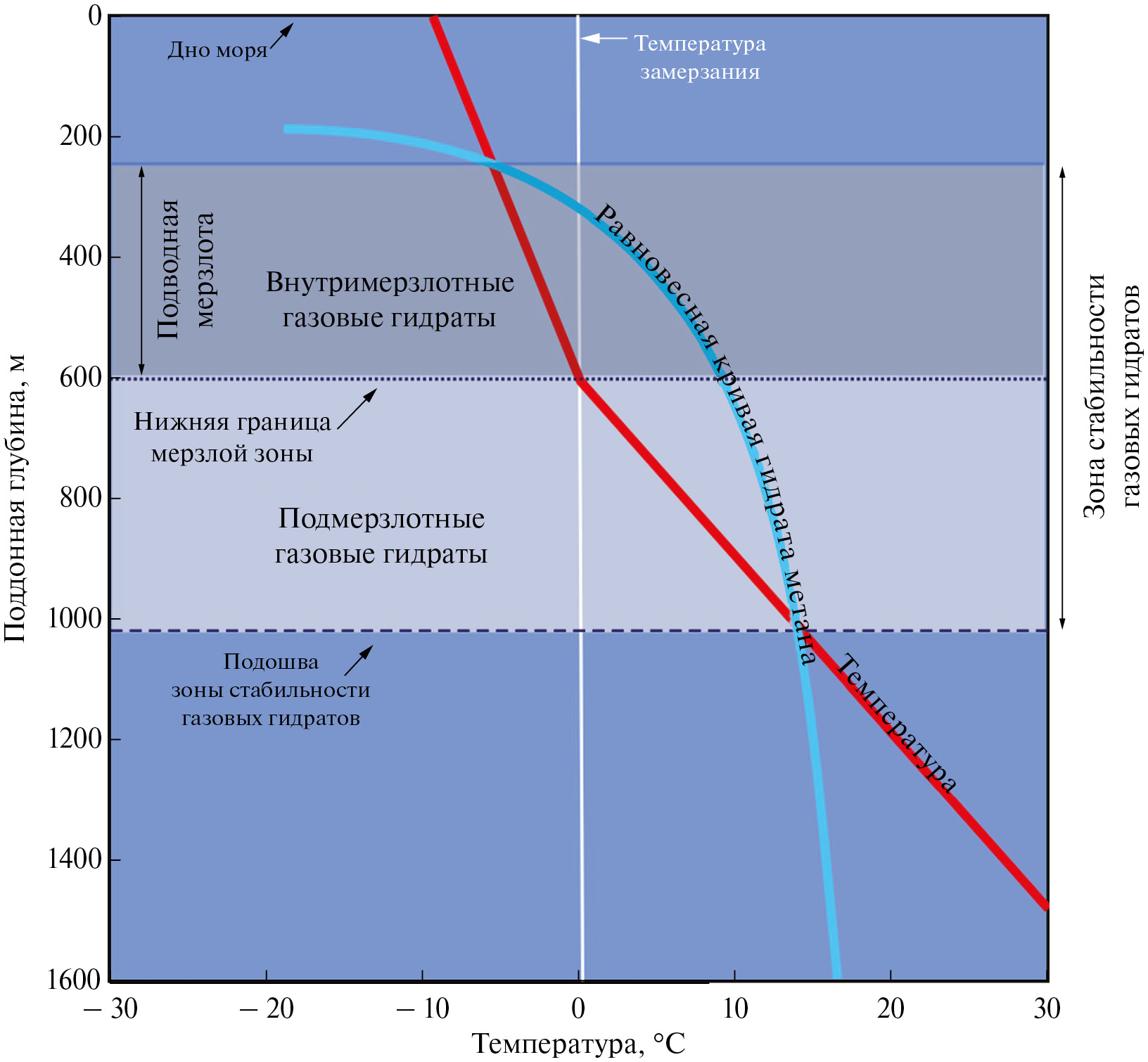 Образование субмаринных газовых гидратов в большинстве случаев приурочено к обстановкам, где есть миграция свободного или водорастворенного газа в зону стабильности газовых гидратов. Условия стабильности газовых гидратов различного состава описываются экспериментальными равновесными кривыми в P‒T осях. В субмаринных условиях параметр давления подменяется давлением столба воды (глубиной моря), а температура ‒ геотермическим градиентом, описывающим поступление тепла из недр (рис. 1).