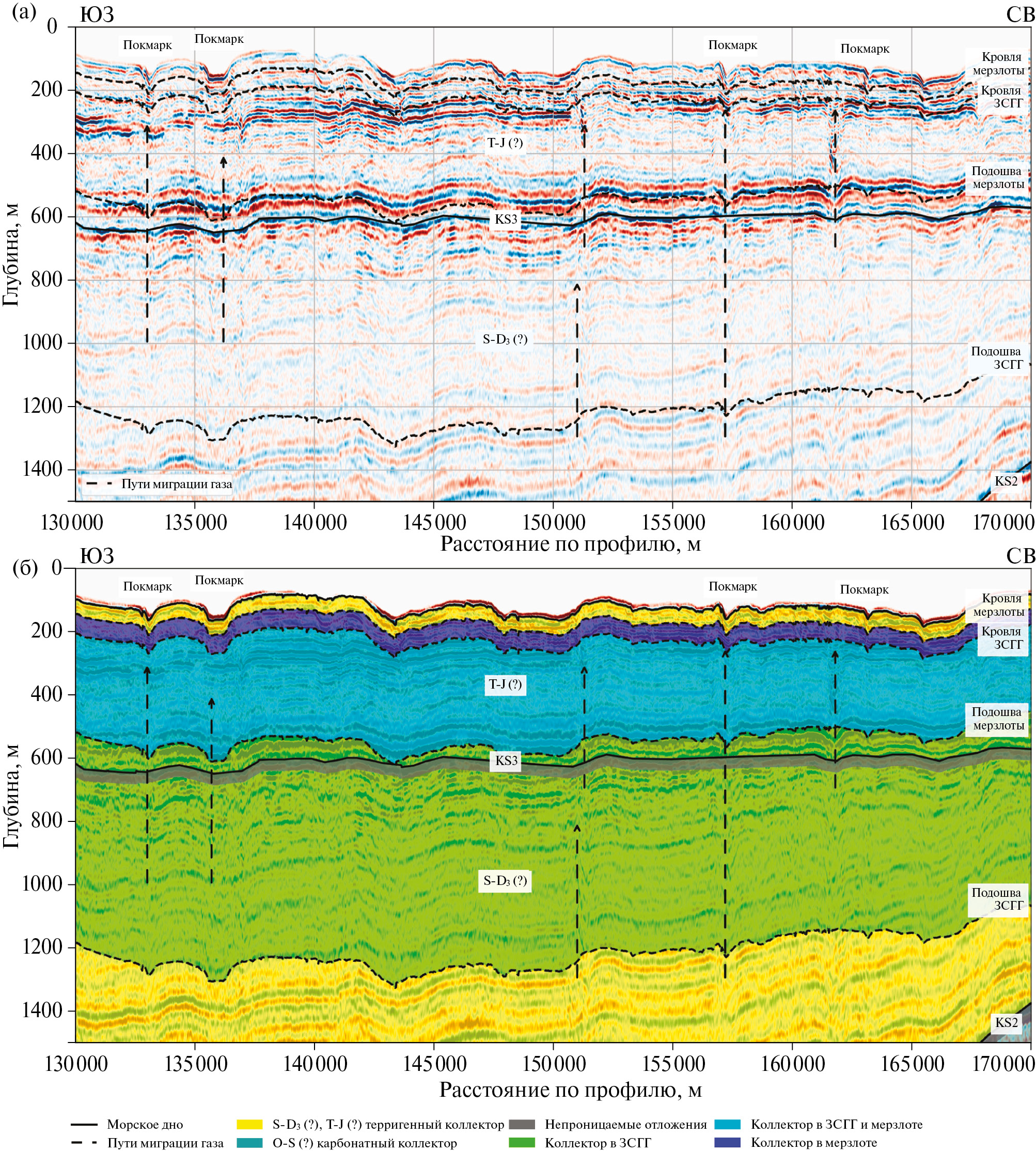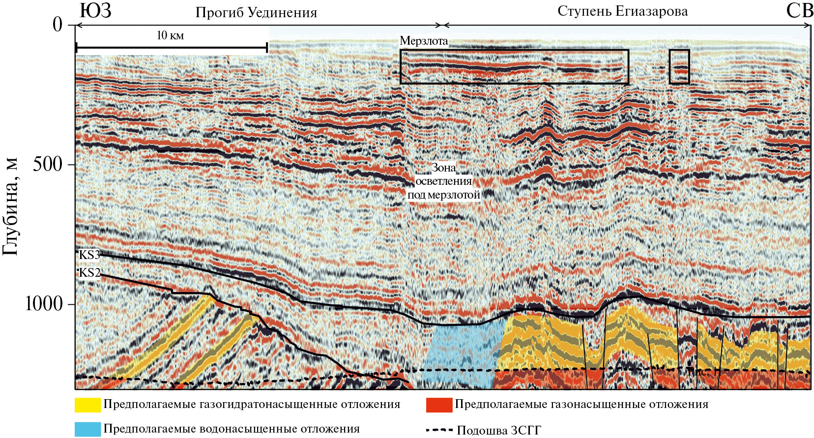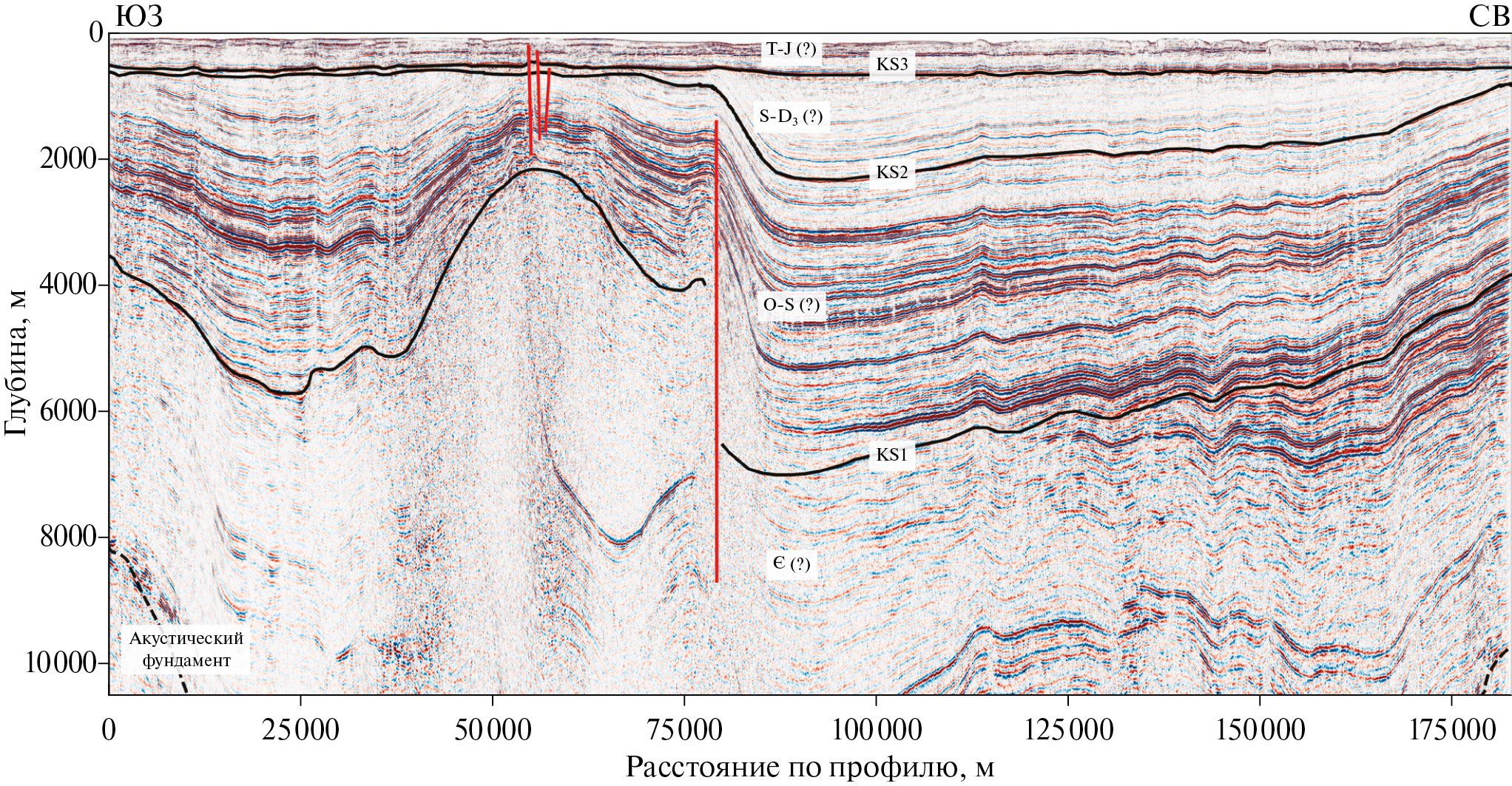 Отражающий горизонт F соответствует поверхности акустического фундамента архей‒протерозойского возраста; горизонты KS-1, KS-2 и KS-3 расчленяют палеозой‒мезозойский осадочный чехол на ряд сейсмических комплексов.