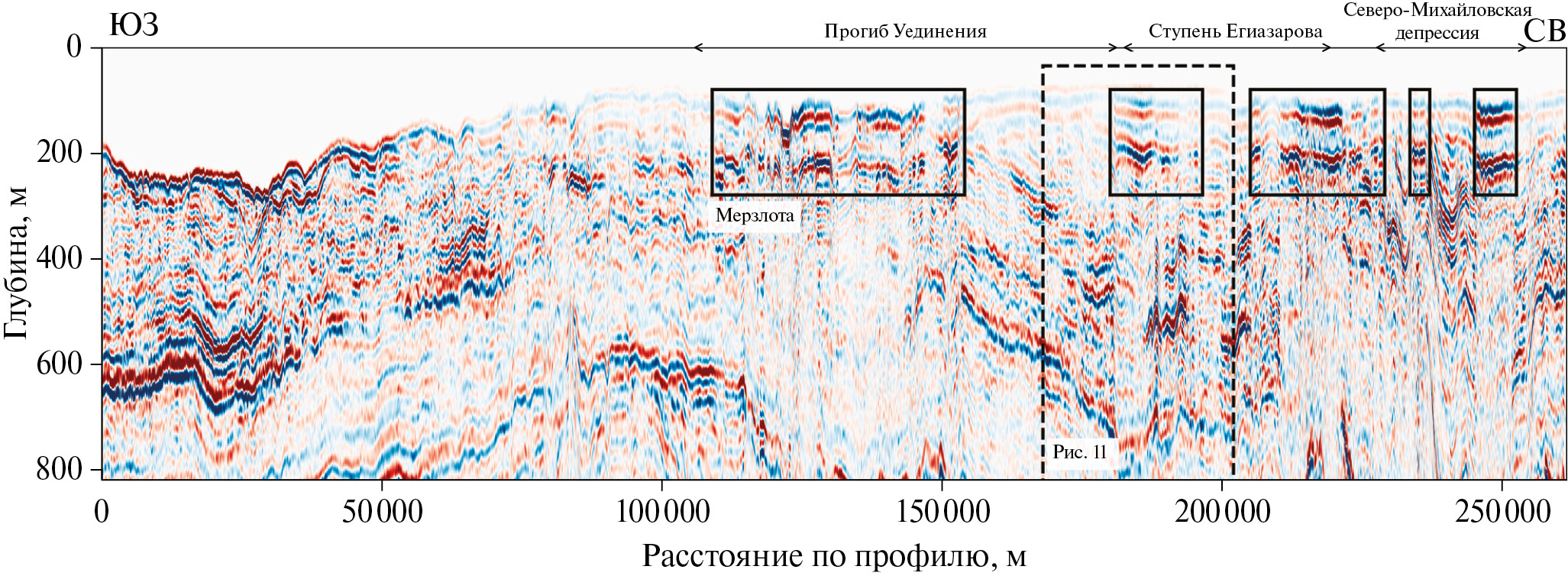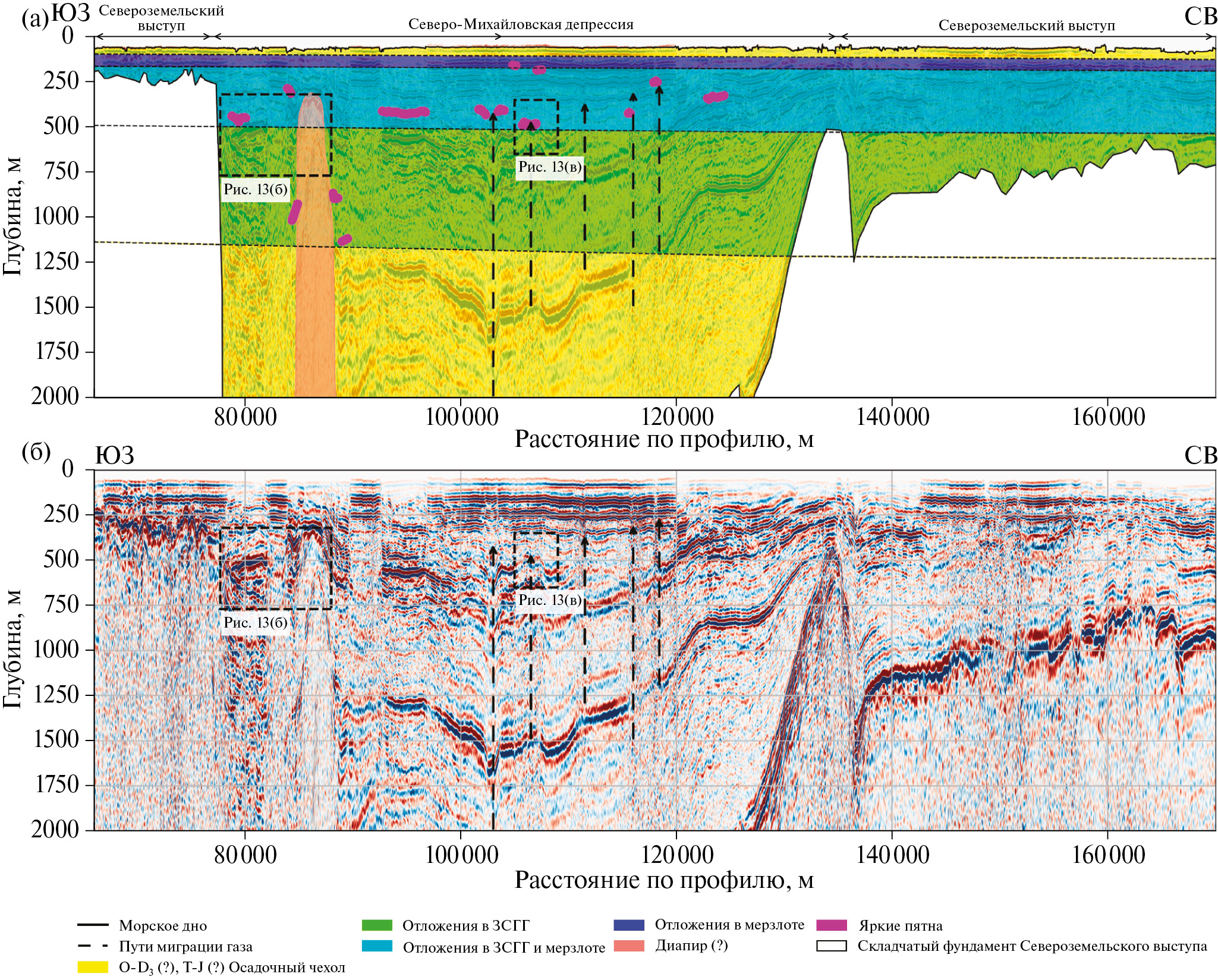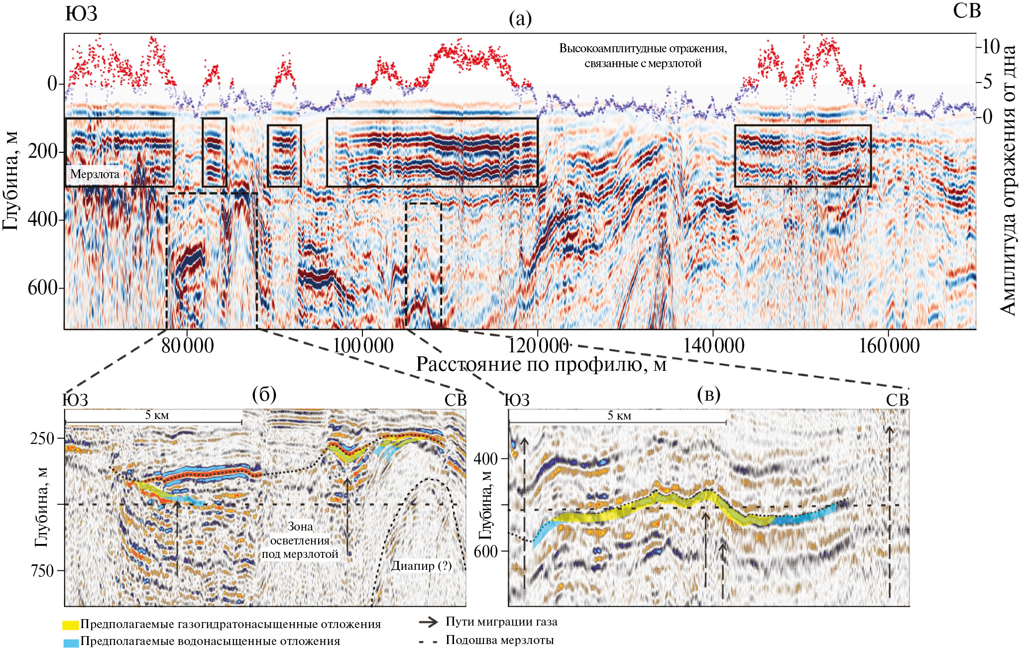 В сводовой части поднятия наблюдаются усиление амплитуд отраженного сигнала, ниже сводовой части определяется вертикальная зона сниженной коррелируемости отражений, что свидетельствует о возможной миграции газа в антиклинальную структуру. Поскольку подошва мерзлоты не проявлена на сейсмическом разрезе, мы полагаем, что это ‒ подмерзлотное скопление газогидратов.