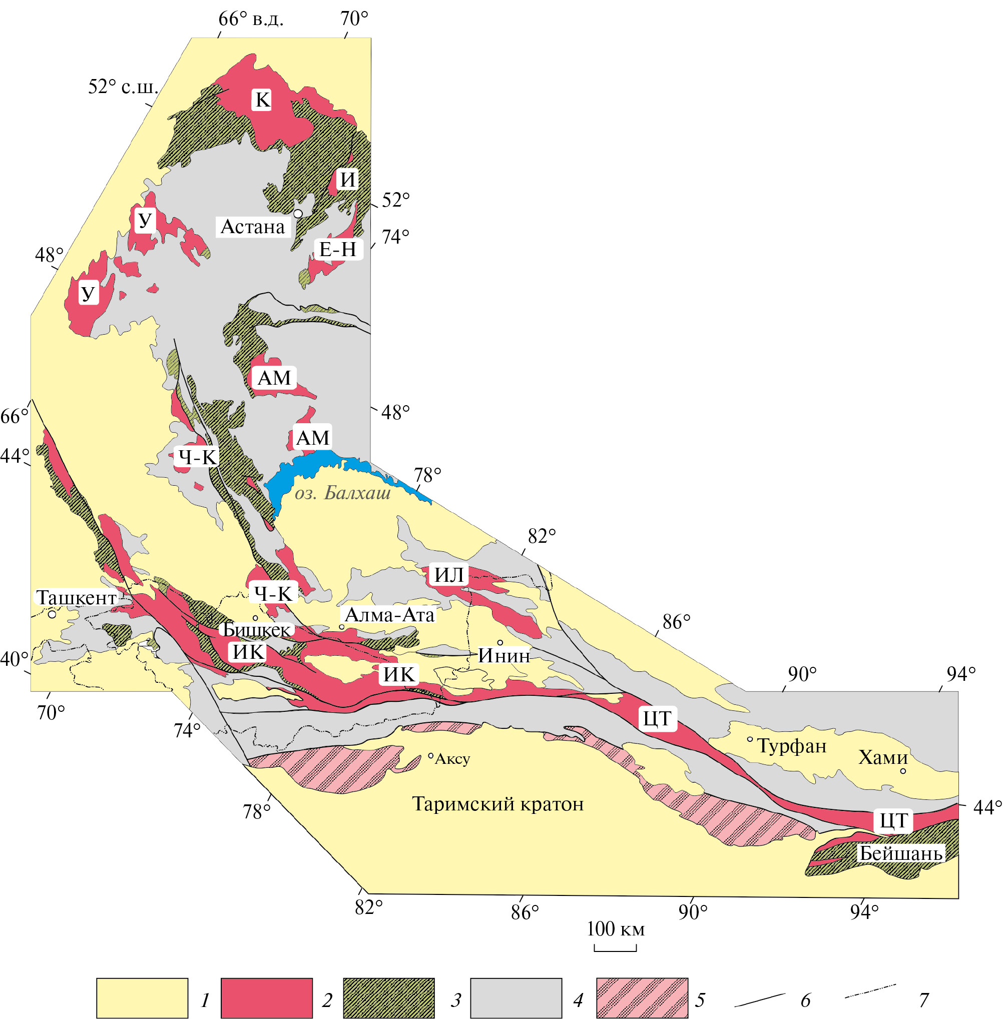 Обозначены докембрийские террейны: К – Кокчетавский; И – Ишкеольмесский; Е-Н – Ерементау-Ниязский; АМ – Актау-Моинтинский; У – Улутауский; Ч-К – Чуйско-Кендыктасский; ИЛ – Илийский; ИК – Иссыккульский; ЦТ – Центрально-Тяньшаньский.