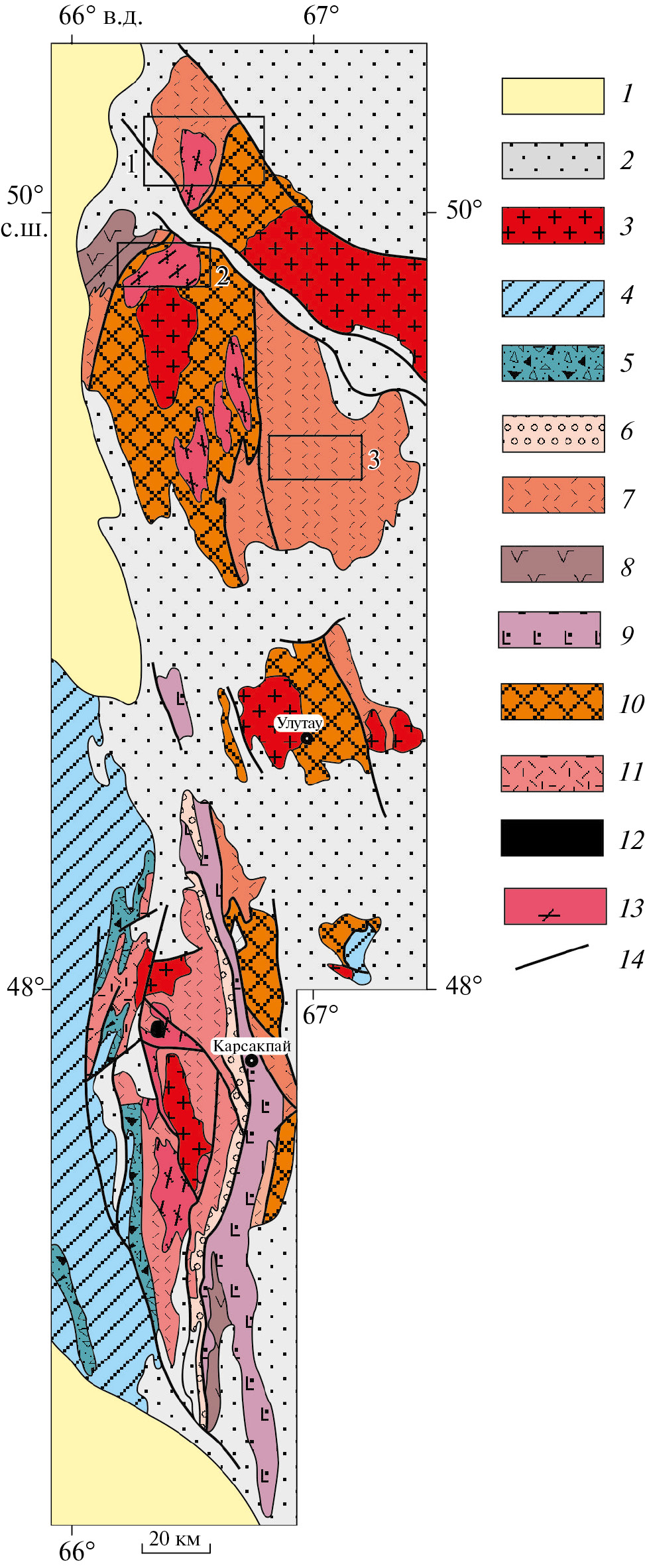 1 ‒ мезозойско‒кайнозойские отложения; 2 – девонские и каменноугольные вулканогенные толщи; 3 – палеозойские гранитоиды; 4‒9 ‒ толщи: 4 ‒ нижнепалеозойские кремнисто-терригенные и терригенные, 5 – эдиакарские вулканогенно-осадочные и грубообломочные, 6 – позднетонийские вулканогенно-осадочные и грубообломочные боздакской серии, 7 – средне- и позднетонийские вулканогенно-осадочные (аралбайская серия), 8 – средне-позднетонийские и эдиакарские (карсакпайская серия), 9 ‒ средне-позднетонийские и эдиакарские (белеутинская серия); 10 – метаморфические комплексы (бектурганская и баладжездинская серии); 11 – среднетонийские вулканогенно-осадочные толщи кислого состава (майтюбинская и коксуйская серии); 12 ‒ карсакпайский комплекс щелочных сиенитов; 13 – массивы среднетонийских гранитоидов; 14 – геологические границы