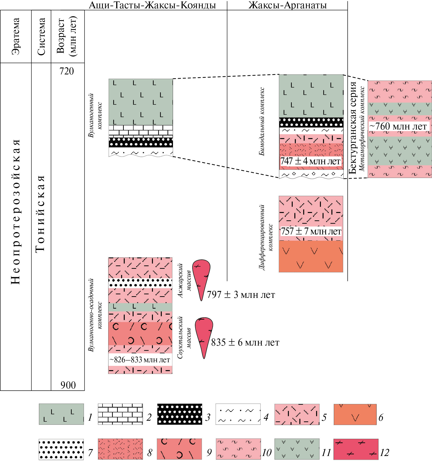 В западной (Майтюбинской) зоне распространены анорогенные вулканогенные и вулканогенно-осадочные толщи кислого состава (майтюбинская и коксуйская серии), входящие вместе с гранитоидами Жаункарского и Актасского комплексов, в состав вулкано-плутонических ассоциаций. Их формирование происходило в интервале 790‒~830 млн лет во внутриплитной обстановке и связано с рифтогенными процессами в тыловой области активной окраины [10]. В восточной (Карсакпайской) зоне распространены дифференцированные, бимодальные вулканогенные и вулканогенно-осадочные толщи (аралбайская и белеутинская серии). Формирование этих комплексов было приурочено к фронтальной области активной окраины (энсиалическая дуга) и связано с двумя этапами надсубдукционного магматизма ~840‒820 и ~760 млн лет [11].