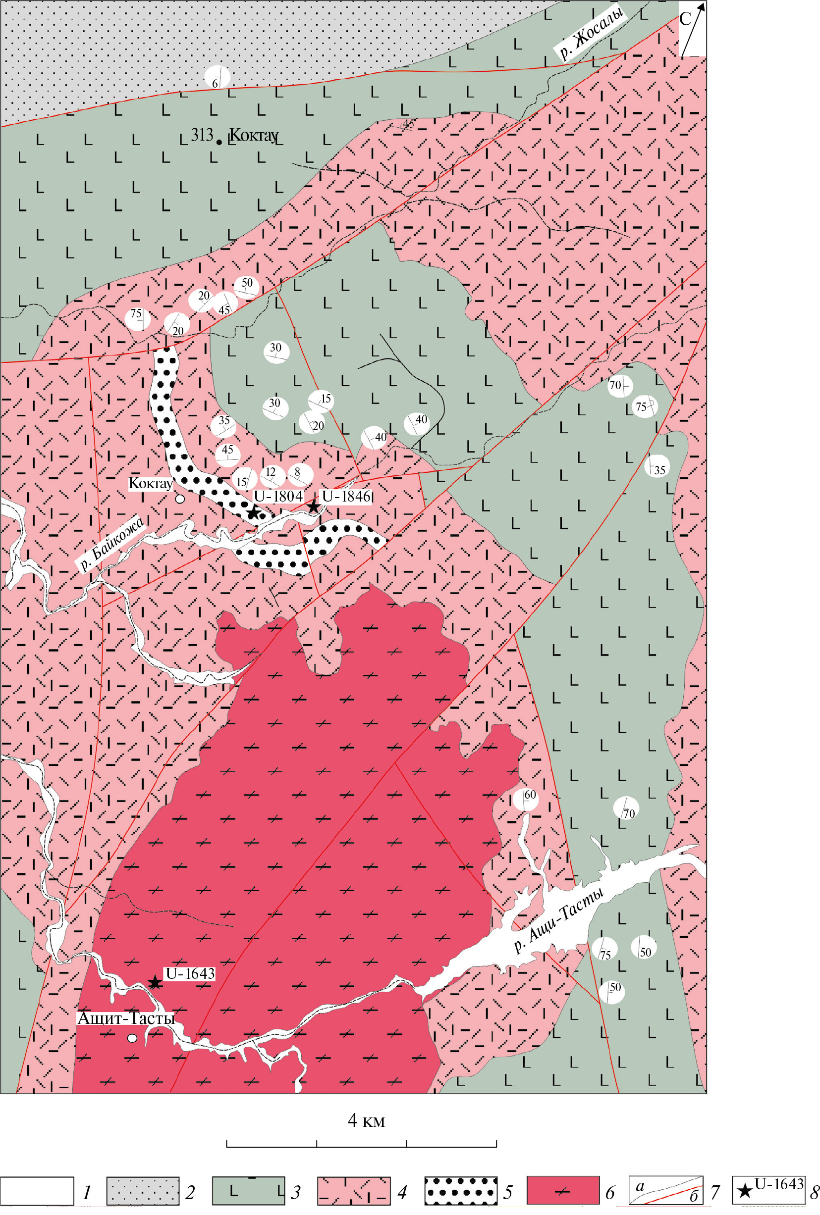 1 – кайнозойские отложения; 2 – девонские вулканогенные толщи; 3 – позднетонийский вулканогенно-осадочный комплекс (эффузивы, туфы основного, кислого состава, сланцы с горизонтами железистых кварцитов и мраморов); 4–5 ‒ среднетонийский вулканогенный комплекс: 4 – эффузивы, туфы среднего, кислого состава, 5 – кианитовые кварциты; 6 – рассланцованные гранитоиды Акжарского массива; 7 – границы: а ‒ геологические, б ‒ тектонические; 8 ‒ точки отбора и номера проб для геохронологических исследований