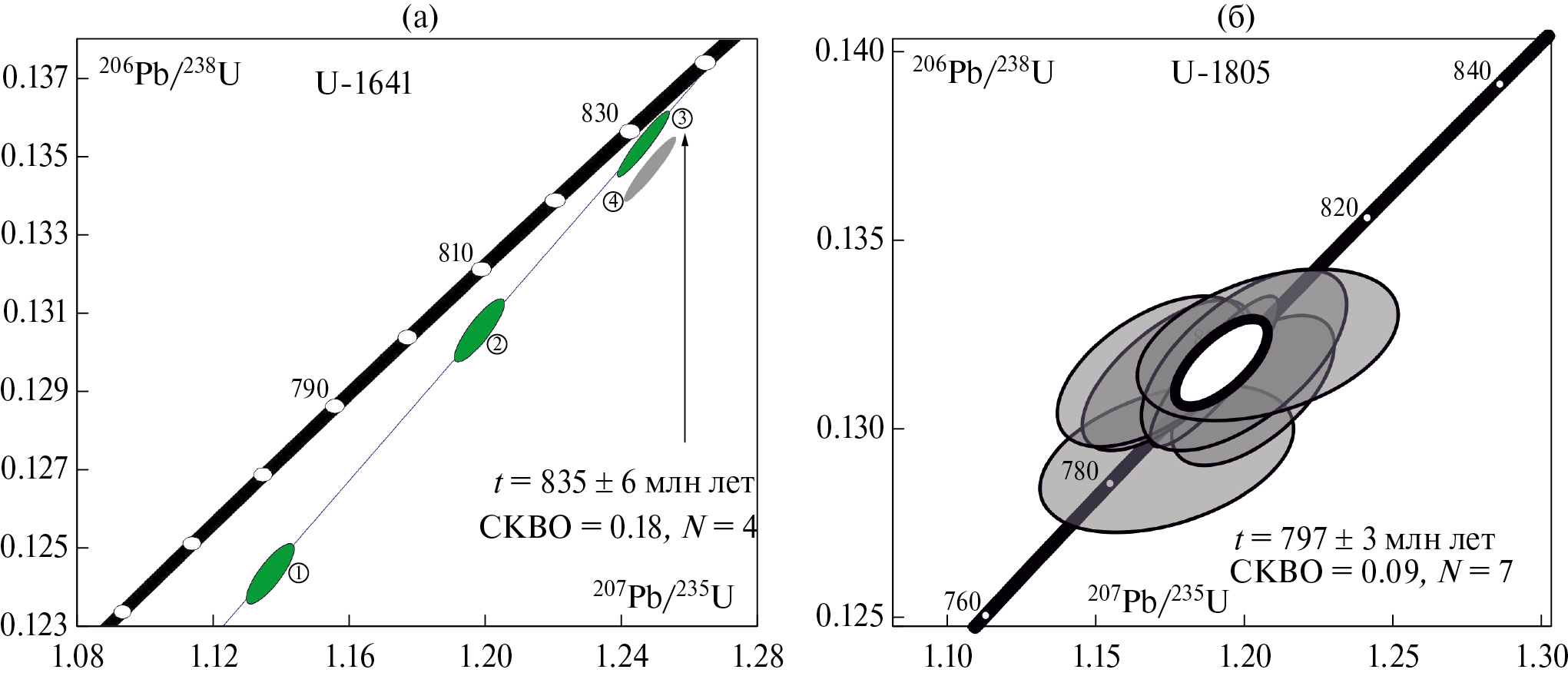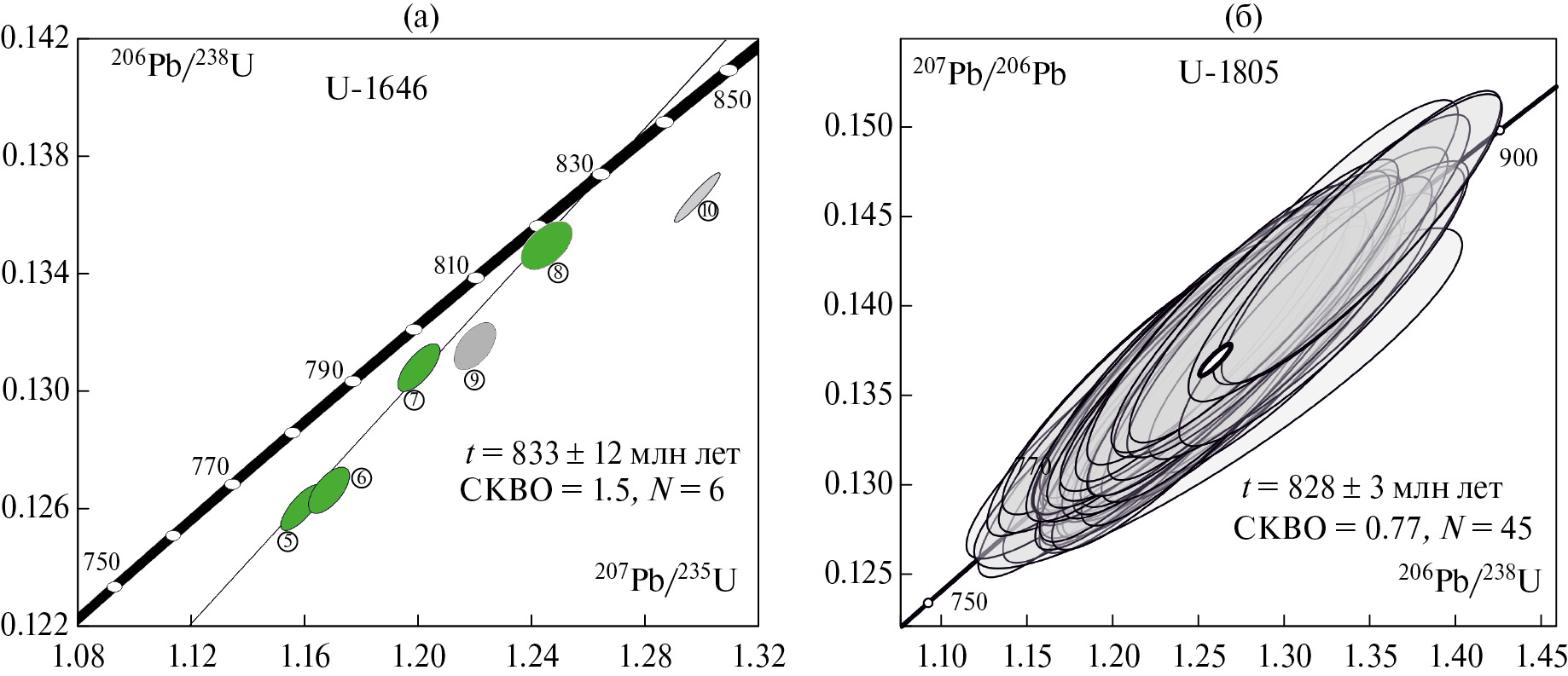 При этом в большинстве случаев кислотной обработке предшествовал высокотемпературный отжиг циркона (“химическая абразия”). Точки изотопного состава аппроксимируются дискордией, верхнее пересечение которой с конкордией отвечает возрасту 833 ± 12 млн лет, нижнее пересечение отвечает нулю (56 ± 220 млн лет), СКВО = = 1.5 (см. табл. 2: №№ 5–8; рис. 7, a).