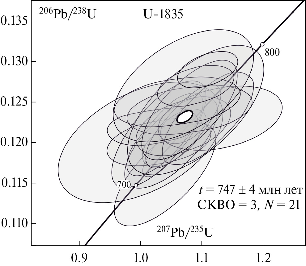 Принимая во внимание морфологические особенности изученного циркона, указывающие на его магматическое происхождение, есть все основания рассматривать оценку возраста 833 ± 12 млн лет в качестве оценки возраста его кристаллизации.