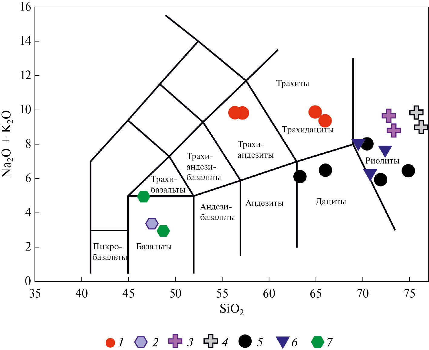 - Le Bas M.J., Le Maitre R.W., Streckeisen A., Zanettin B. A chemical classification of volcanic rocks based on the total alkali-silica diagram // J. Petrol. 1986. Vol. 27. P. 745–750.
