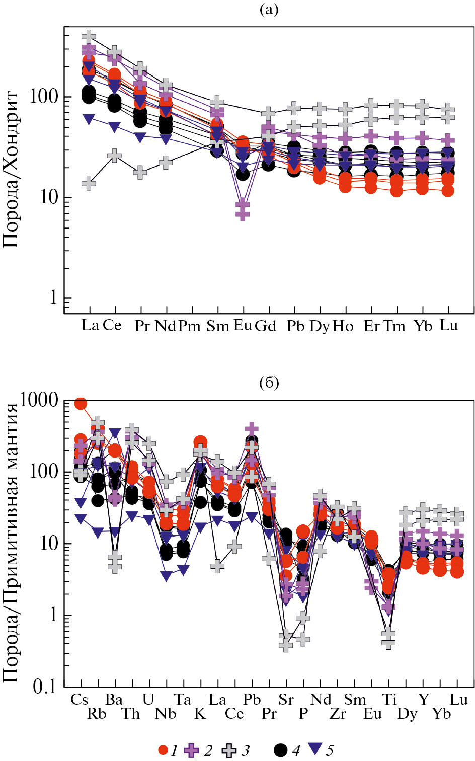 Дифференцированный спектр распределения РЗЭ на фоне обеднения тяжелыми РЗЭ ((Gd/Yb) =1.9–2.9) позволяет предполагать образование расплавов при плавлении гранатсодержащего обогащенного источника мантийного источника. Наше предположение подтверждают значения ΔNb ((1.74 + log(Nb/Y) – 1.92 log(Zr/Y)) в базальтах (1.3–1.8) и амфиболитах (1.2–2.4) [23].