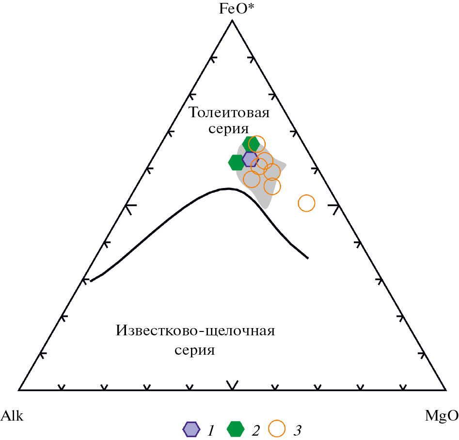 1‒2 – эффузивы основного состава: 1 ‒ вулканогенно-осадочного комплекса участка междуречье Ащи-Тасты – Жаксы-Коянды, 2 – бимодального комплекса участка гор Жаксы-Арганаты; 3 – амфиболиты бектурганской и баладжездинской серий, (по [8])