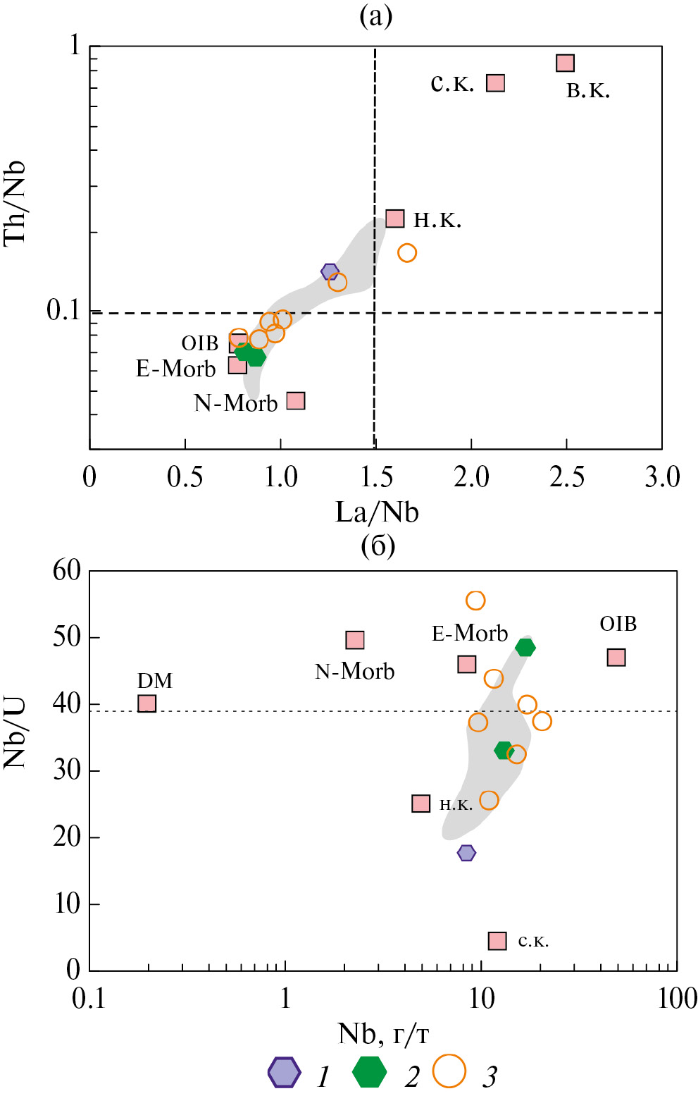 Низкие Th/Nb и высокие Nb/U свидетельствуют о незначительной контаминации веществом нижней континентальной коры, что позволяет рассматривать их геохимические особенности, как отражение состава мантийного источника (рис. 19).