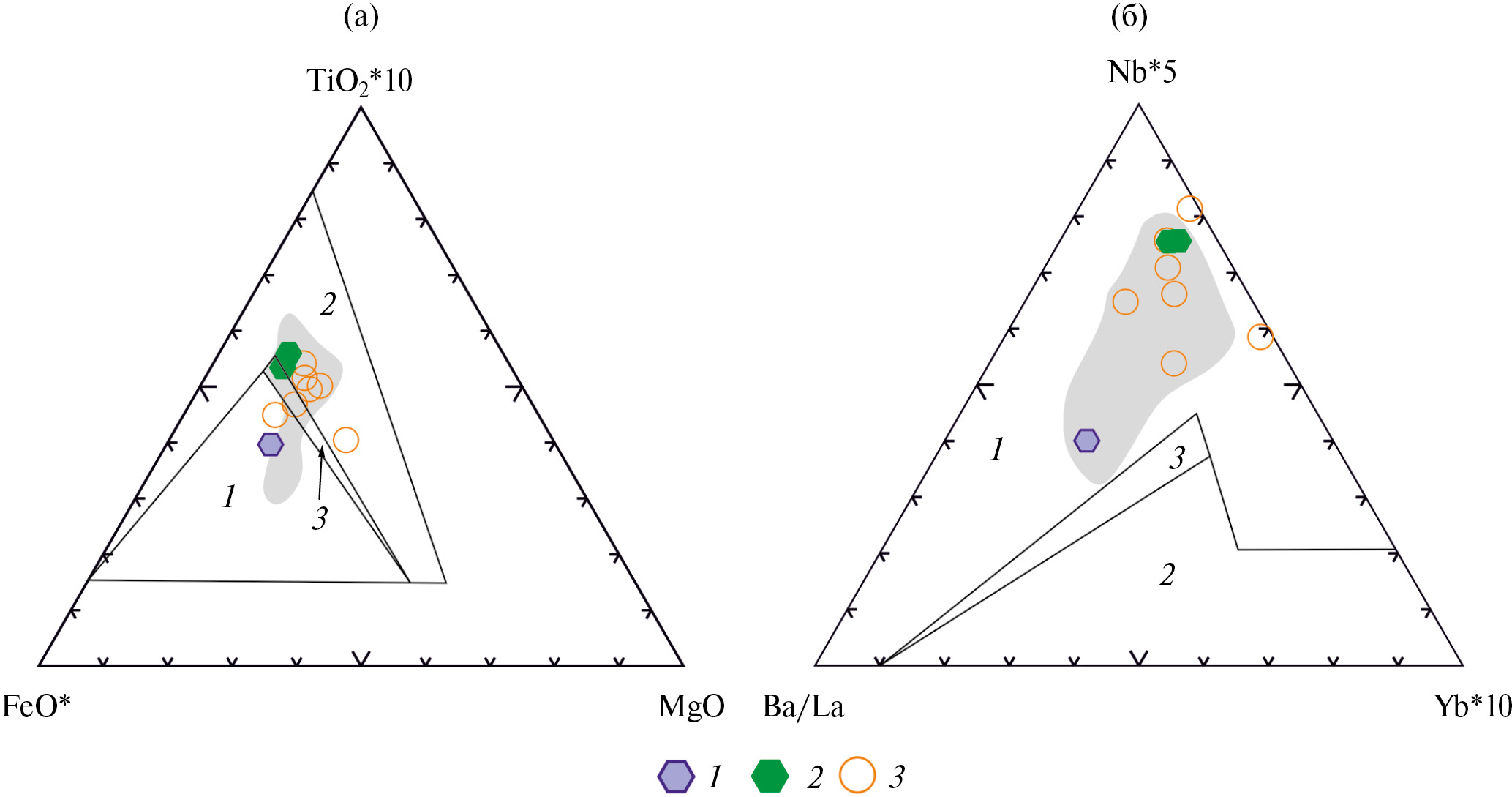 (а) – FeO*‒TiO2‒MgO; (б) – Ba/La‒Nb*5‒Yb*10, (по [25]).