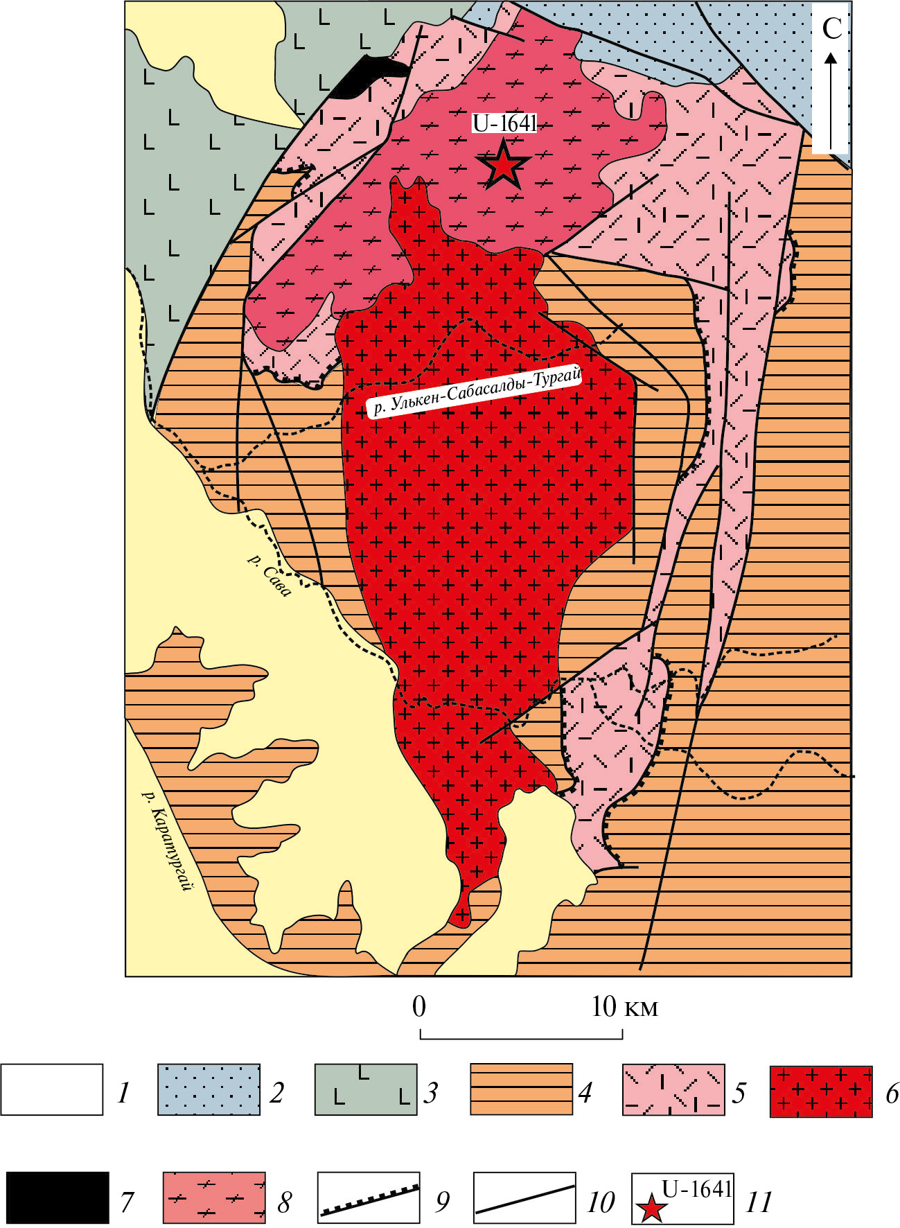 1 – кайнозойские отложения; 2 ‒ девонские и каменноугольные вулканогенные толщи; 3 ‒ позднетонийский вулканогенно-осадочный комплекс (эффузивы, туфы основного, кислого состава, сланцы с горизонтами железистых кварцитов и мраморов); 4 ‒ метаморфические комплексы (бектурганская серия); 5 ‒ среднетонийский вулканогенный комплекс (эффузивы, туфы среднего, кислого состава); 6 – позднеордовикские гранитоиды; 7 – раннепалеозойские (?) ультрабазиты; 8 – рассланцованные гранитоиды Соуктальского массива; 9 – разрывные нарушения; 10 – геологические границы; 11 ‒ точки отбора и номера проб для геохронологических исследований
