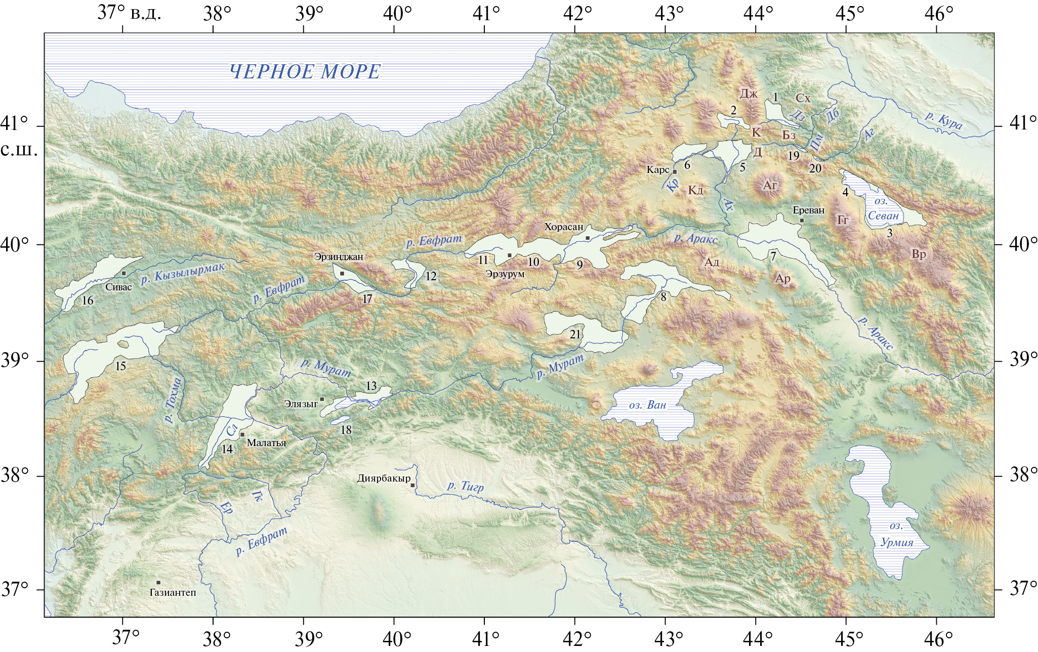 Впадины (арабские цифры): 1 – Лорийская; 2 – Верхнеахурянская; 3 – Большого Севана; 4 – Малого Севана; 5 – Ширакская; 6 – Сусузская; 7 – Араратская; 8 – Агры; 9 – Хорасанская; 10 – Пасинлерская; 11 – Эрзурумская; 12 – Чайирли–Терджан; 13 – Палу; 14 – Малатья; 15 – Кангальская; 16 – Сивасская; 17 – Эрзинджанская; 18 – оз. Хазар; 19 – Ванадзорская; 20 – Фиолетовская; 21 – Хынысская