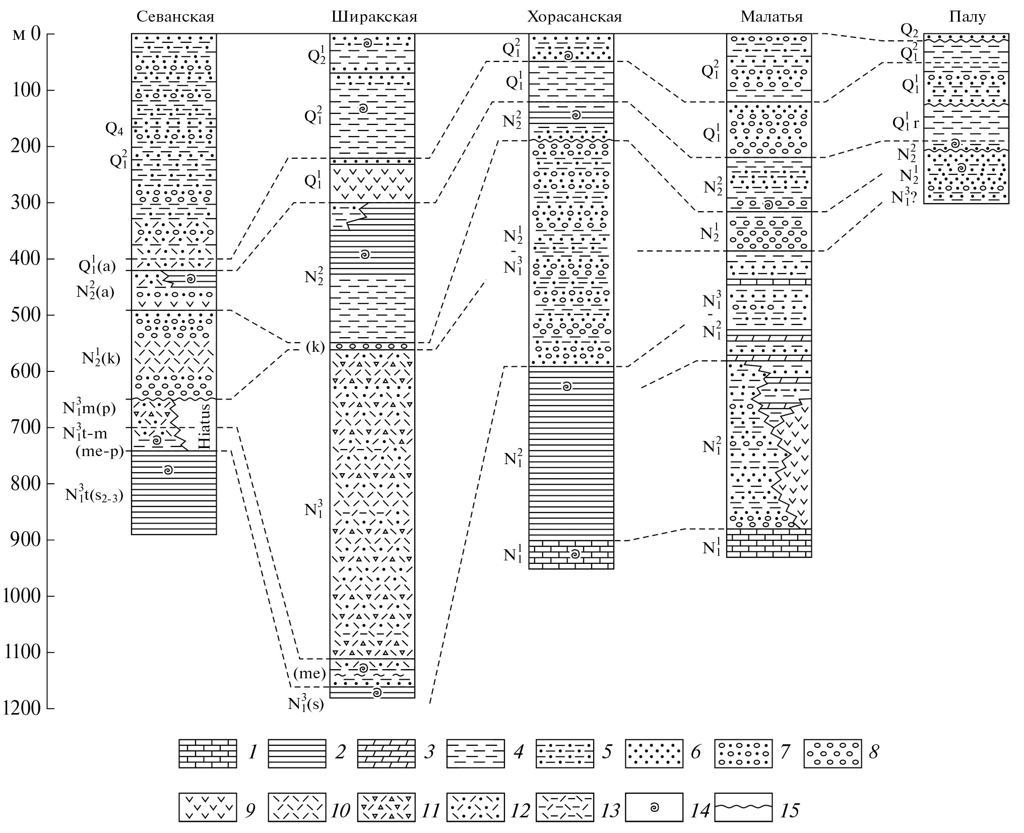 Рис. 3. Сводные разрезы неоген‒четвертичных отложений новейших впадин Севанской, Ширакской, Хорасанской, Маалатья и Палу.