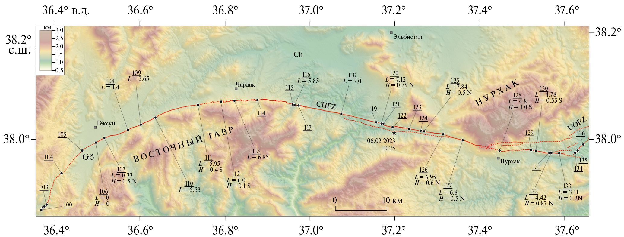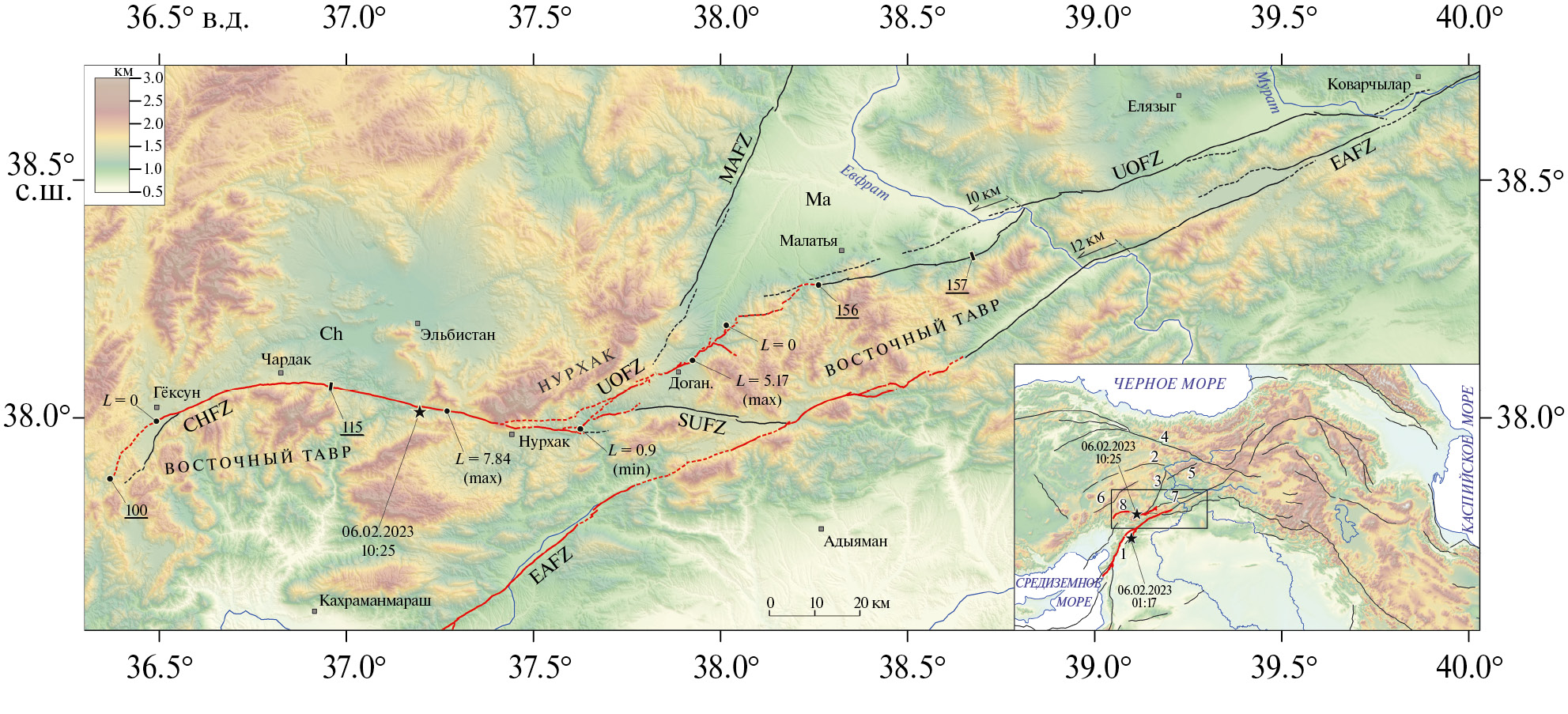 При Эльбистанском землетрясении были активизированы соседние сегменты зон разломов Чардак и Улуова, причем разлом Улуова ранее считался неактивным [14] (рис. 1). По возникшим сейсморазрывам на отрезке длиной 148 км произошли левосдвиговые смещения.
