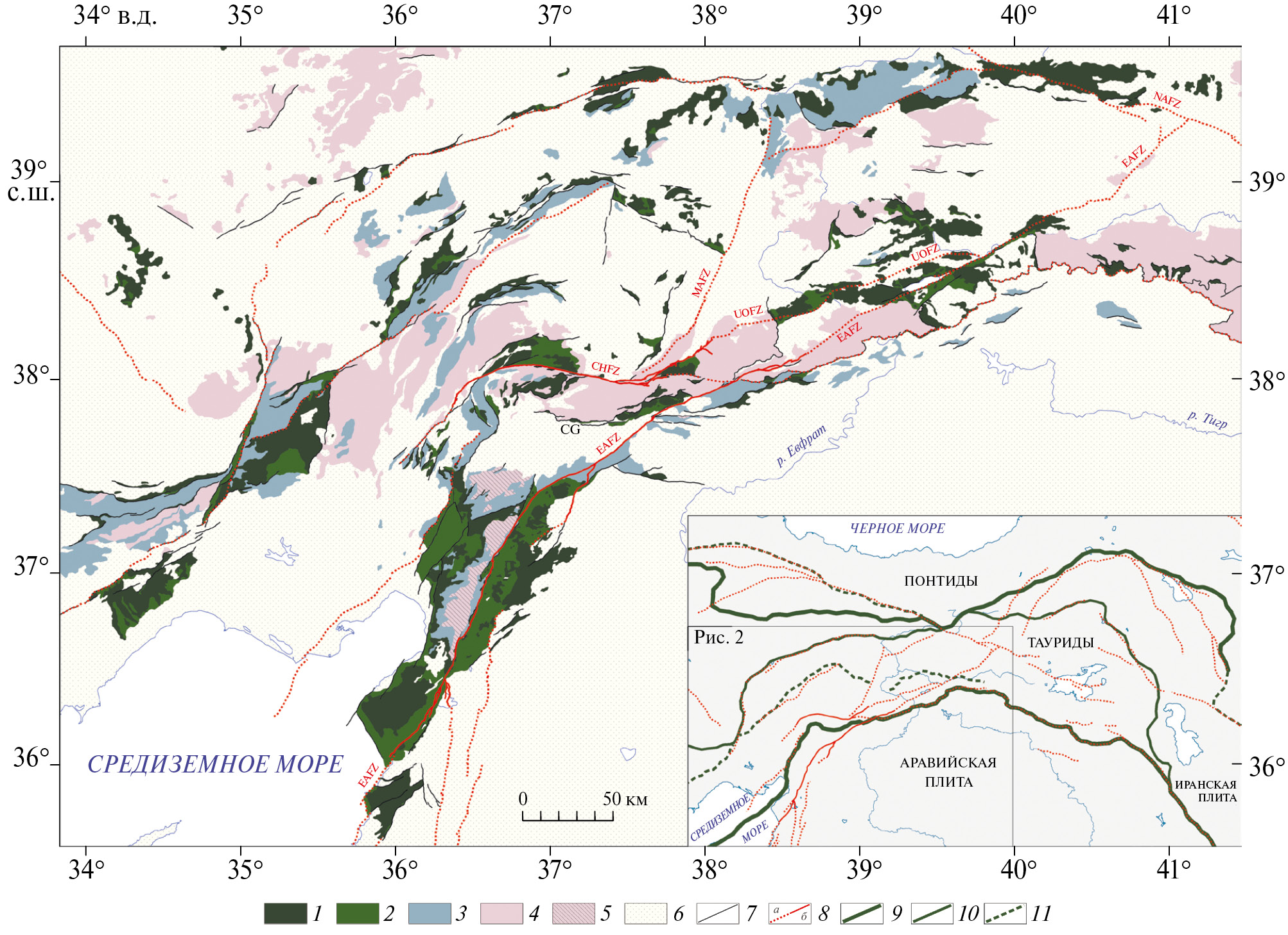 Определяющими элементами мезозойско-кайнозойской тектонической зональности являются две зоны офиолитовых сутур. На севере это восточные сегменты сутуры Измир–Анкара–Эрзинджан, которая продолжается на восток офиолитами Базумского хребта и Севано-Акеринской зоны Армении, и на юге – сутура Южного Тавра, которая на западе достигает залива Искендерун и продолжается структурами южного обрамления Кипрской дуги, а на востоке переходит в сутуру Главного надвига Загроса [6, 8, 18, 26] (рис. 2).