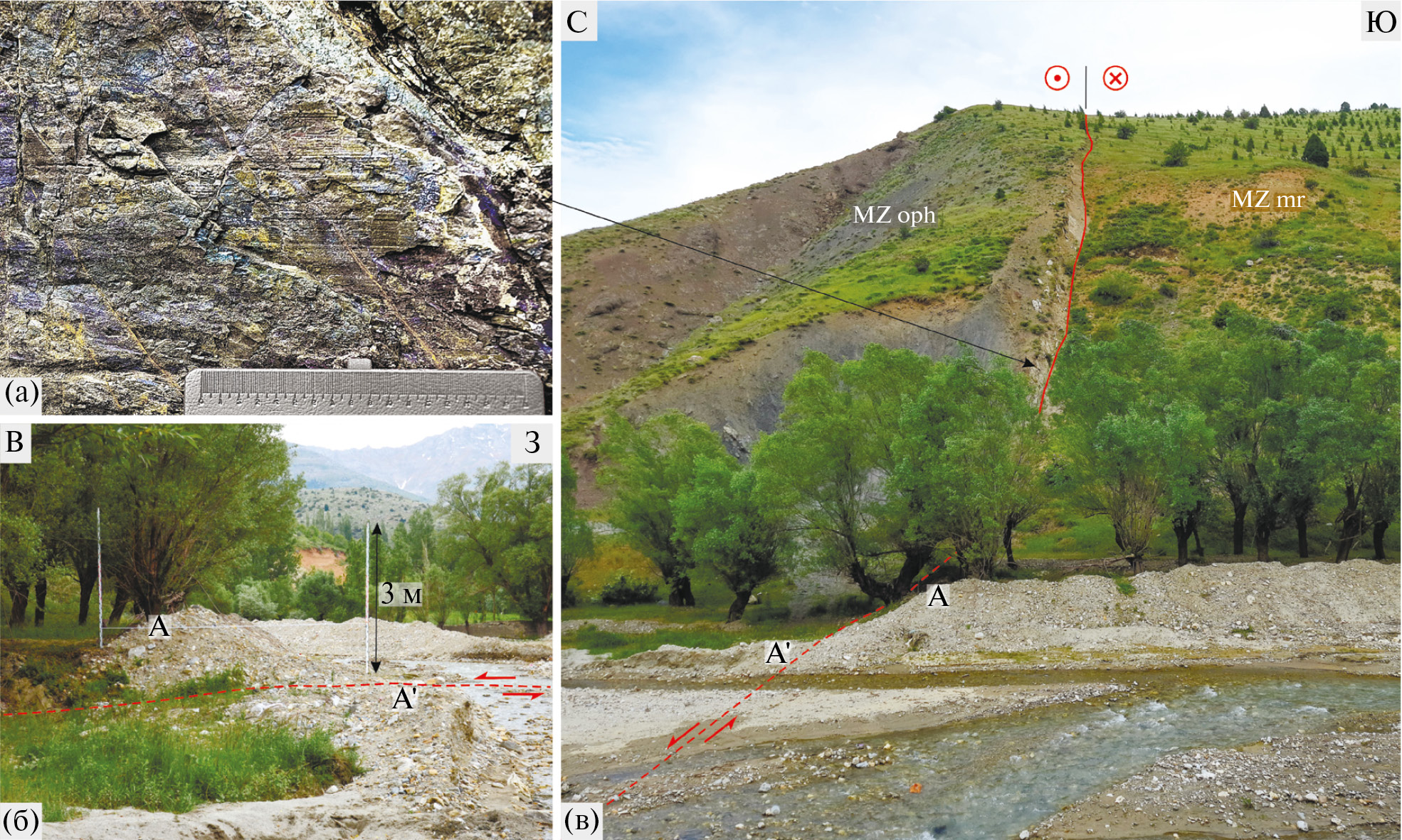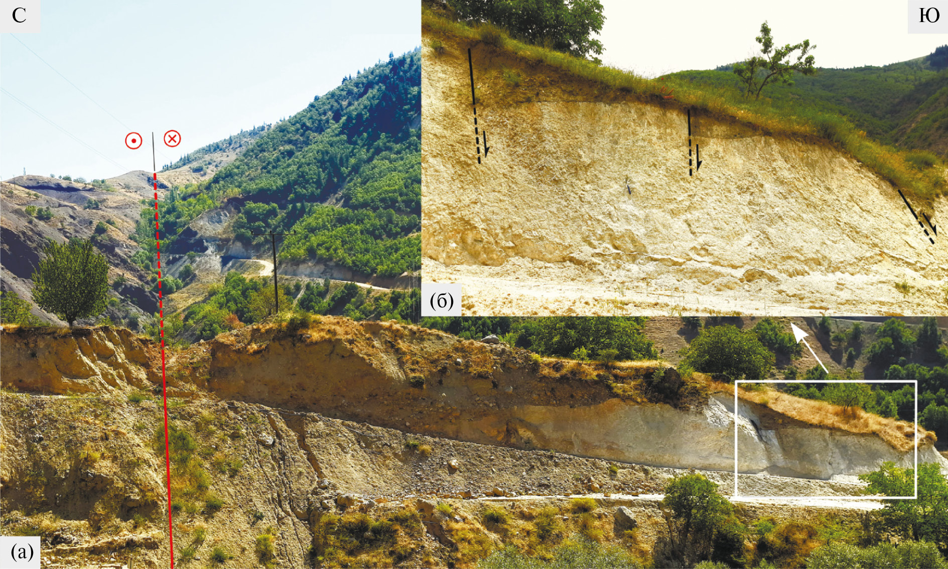 (а) – современный сейсморазрыв (линия красным); (б) ‒ следы разновозрастных более ранних смещений (линии черным).