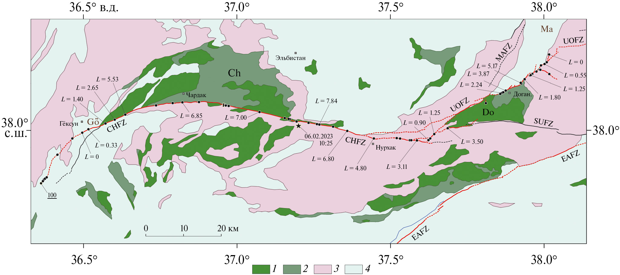 1–2 – активные разломы: 1 – крупнейшие, 2 – крупные; 3 – разломы, активизированные при землетрясениях 06.02.2023 г.