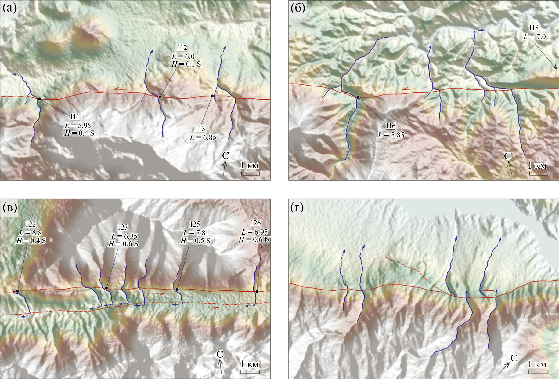 Эти смещения вызваны подвижками по молодой южной ветви разлома Улуова, простирающейся на северо-восток от точки 156 и подтвержденной тренчингом в точке 157 (см. рис. 1). Левосдвиговые смещения двух параллельных долин в 9-ти км юго-западнее показывают существенно меньшие амплитуды. Такое несоответствие мы объясняем реализацией подвижек по ветви разлома северо-западного простирания (см. рис. 9, г).