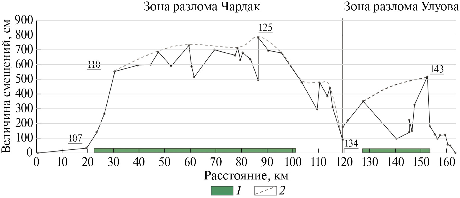 После достижения этой величины график смещений выходит на плато со средними значениями ~6.5 м. При этом линия графика представляет собой пилообразную кривую. Участки пониженных значений смещений между соседними пиками мы объясняем неполнотой полевых данных. Возможно, это связано с реализацией леводсвиговых смещений по оперяющим структурам, не обнаруженным в поле. Ввиду этого в график была введена аппроксимирующая кривая, подчеркивающая плато со значениями смещений ~6–7 м.