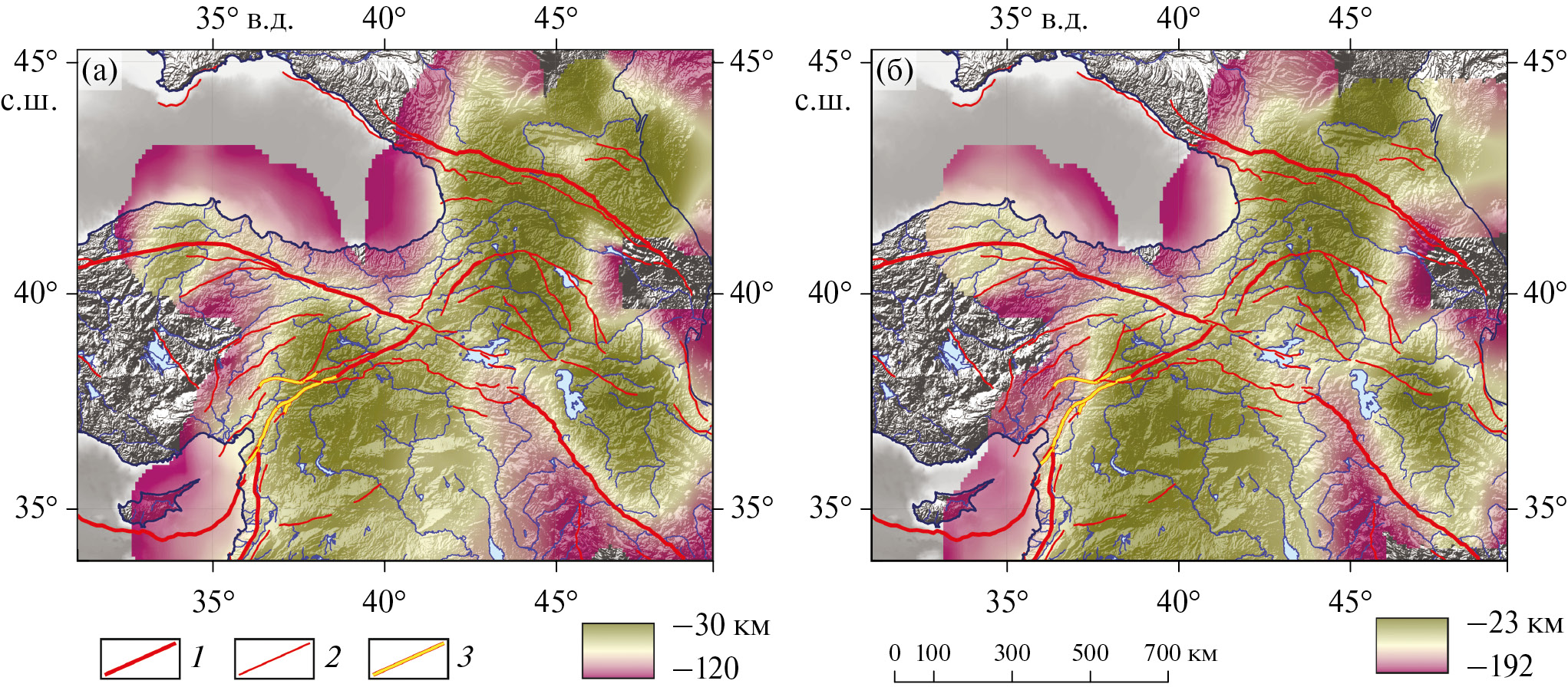 Рис. 11. Положение кровли (км ниже уровня моря) объемов нижней части земной коры и верхней мантии с пониженными скоростями P-волн под Кавказом, Закавказьем, Восточной Турцией, Сирией, Северным Ираком, Северо-Западным Ираном, рассчитанное на основе сейсмотомографической модели MITP08 [22]: (а) – по значению dVp = –0.37%; (б) – по значению dVp = –0.60%.