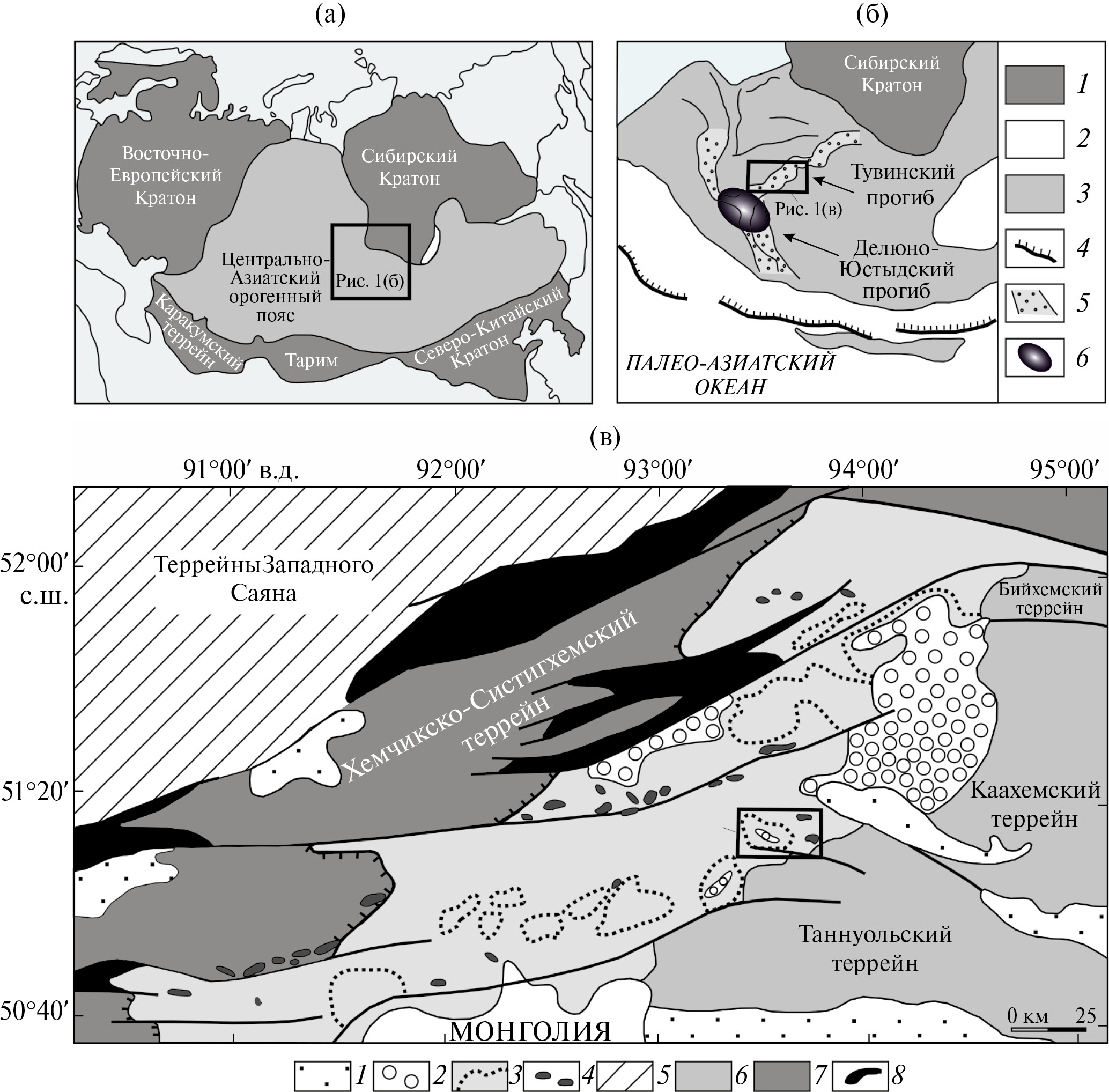 Рис. 1. Положение Тувинского прогиба в Центрально-Азиатском орогенном поясе (ЦАОП) (а), в строении Алтае-Саянской рифтовой системы (б), фрагмент упрощенной тектонической схемы Тувинского сегмента ЦАОП (в), (по данным [45]).На (а): 1 ‒ Сибирский кратон; 2 ‒ Палео-Азиатский океан; 3 ‒ позднепротерозойские (?)‒раннепалеозойские островодужные и аккреционные террейны; 4‒5 ‒ зоны: 4 ‒ субдукции, 5 ‒ рифтогенеза; 6 ‒ предполагаемая горячая точка. На (в): 1 ‒ кайнозойские отложения; 2 ‒ мезозойские впадины; 3 ‒ стратифицированные образования Тувинского прогиба (пунктиром показаны каменноугольные мульды); 4 – базитовые интрузии Тувинского прогиба; 5‒7 ‒ террейны: 5 ‒ раннепалеозойские турбидитовые Западного Саяна, 6 ‒ позднепротерозойские (?)‒раннепалеозойские островодужные и аккреционные Восточной Тувы, 7 ‒ раннепалеозойский Хемчикско-Систигхемский; 8 ‒ офиолитовые комплексы