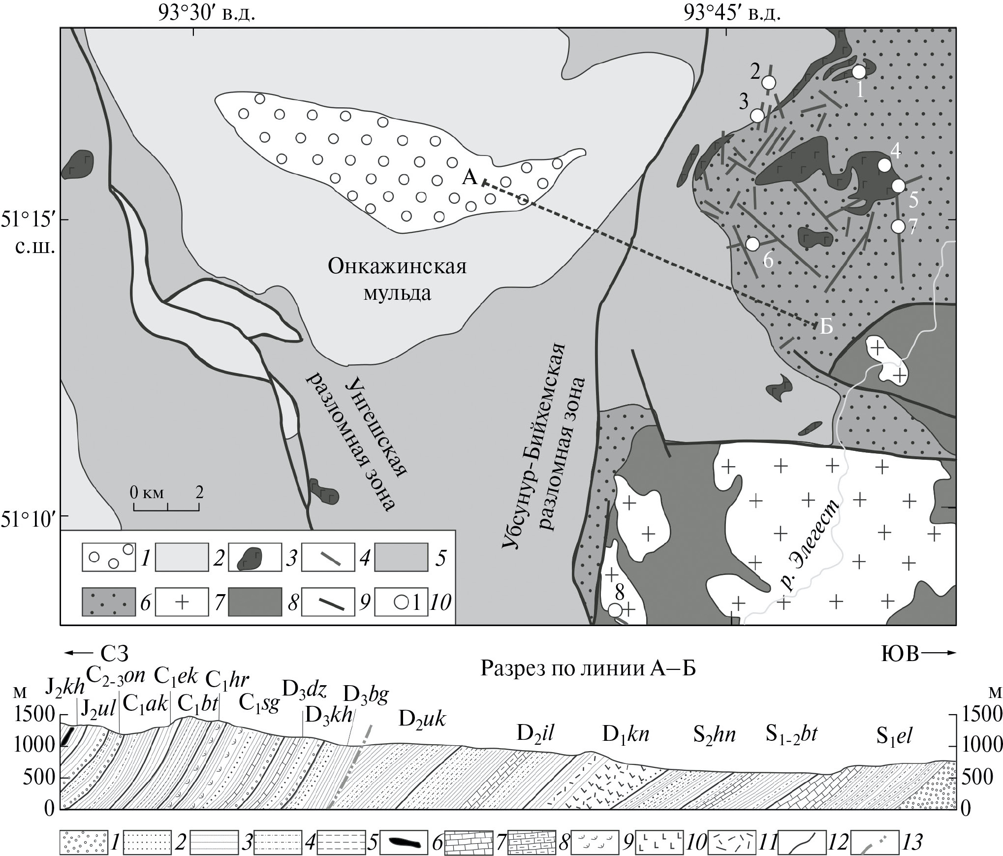 Рис. 2. Геологическая схема и разрез краевой части Тувинского прогиба с указанием мест отбора проб для Ar‒Ar датирования полевых шпатов. На схеме: 1 – юрские отложения; 2 – каменноугольные отложения; 3, 4 – базитовые интрузии (3 – силлы, штоки; 4 – дайки); 5 – девонские отложения; 6 – силурийские отложения; 7 – кембрийские гранитоиды; 8 – кембрийские вулканогенные образования; 9 – разрывные нарушения; 10 – места отбора проб для Ar‒Ar геохронологических исследований. На разрезе: 1 – конгломераты; 2 – гравелиты; 3 – песчаники; 4 – алевролиты; 5 – аргиллиты; 6 – каменный уголь; 7 – известняки; 8 – мергели; 9 – туфы; 10 – базальты; 11 – риолиты; 12 – стратиграфический контакт; 13 – тектонический контакт