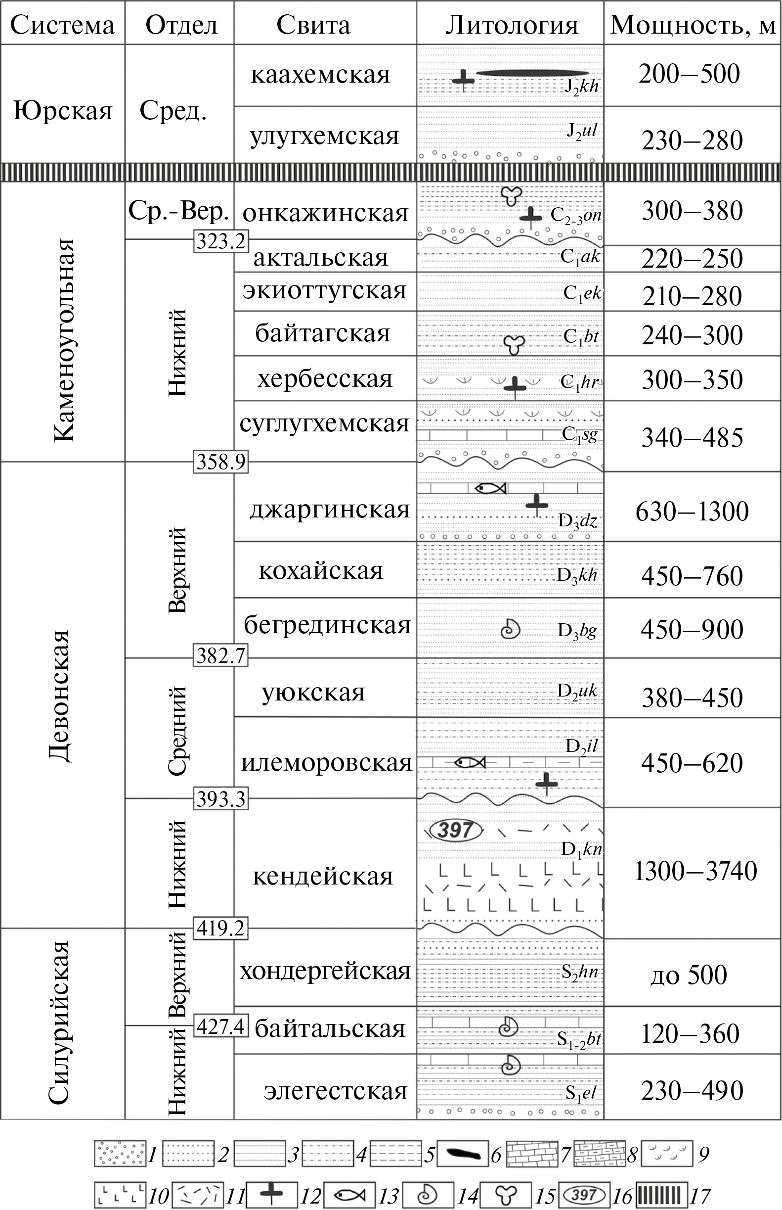 Рис. 3. Стратиграфическая колонка отложений Тувинского прогиба. Абсолютный возраст (млн лет) границ отделов показан условно (по данным [50]). 1‒11 ‒ литология: 1 – конгломераты, 2 – гравелиты, 3 – песчаники, 4 – алевролиты, 5 – аргиллиты, 6 – каменный уголь, 7 – известняки, 8 – мергели, 9 – туфы, 10 – базальты, 11 – риолиты; 12‒16 ‒ ископаемые остатки: 12 – макрофлора, 13 – кости рыб, 14 – беспозвоночные, 15 – споры и пыльца, 16 – возраст (млн лет), определенный по U‒Pb датированию циркона; 17 – денудированный разрез