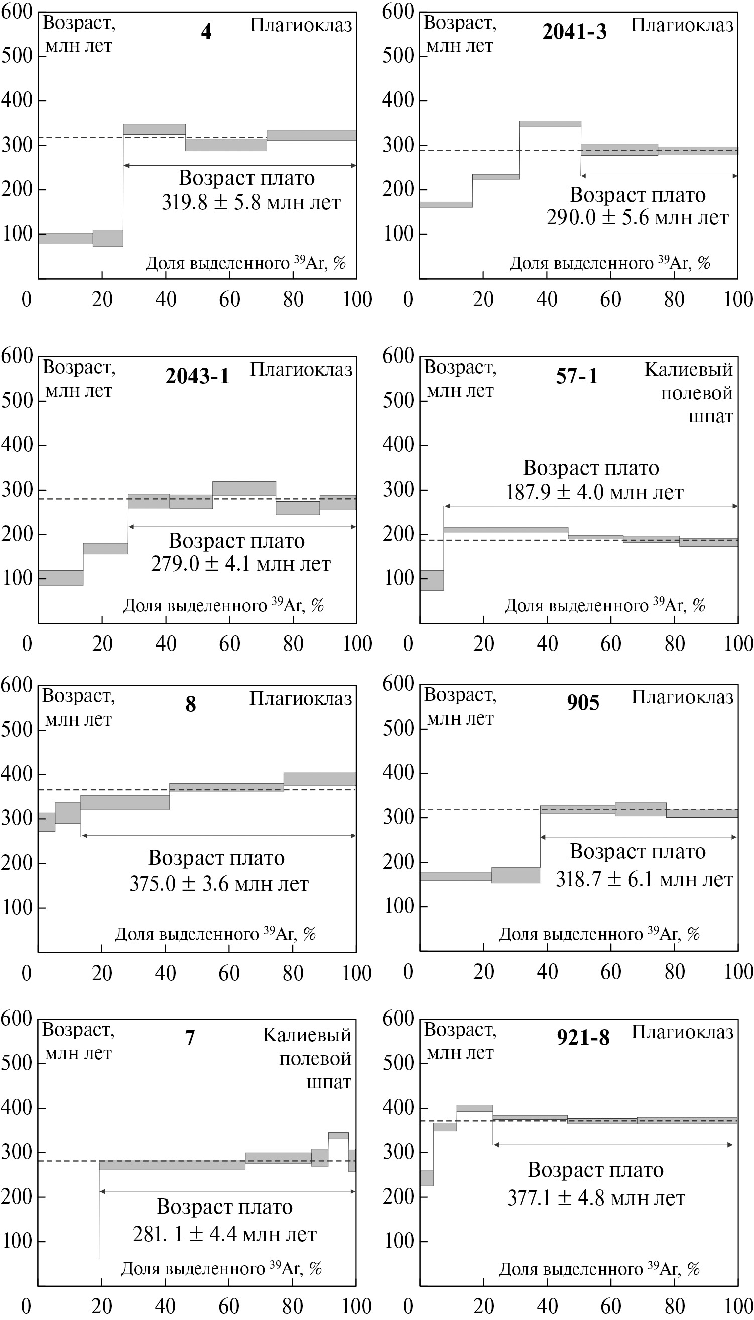 Монофракции полевых шпатов для Ar‒Ar геохронологических исследований выделялись с использованием стандартных методик, включающих магнитную и плотностную сепарацию, отбор минералов вручную под бинокуляром. Затем эти мономинеральные фракции были завернуты в алюминиевую фольгу и после откачки из нее воздуха запаивались в кварцевую ампулу. В качестве мониторов использовался стандарт – биотит МСА-11 с возрастом 313,8±9 млн лет, сертифицированный по стандартным международным образцам (биотиту LP-6 и мусковиту Bern 4m [48]).