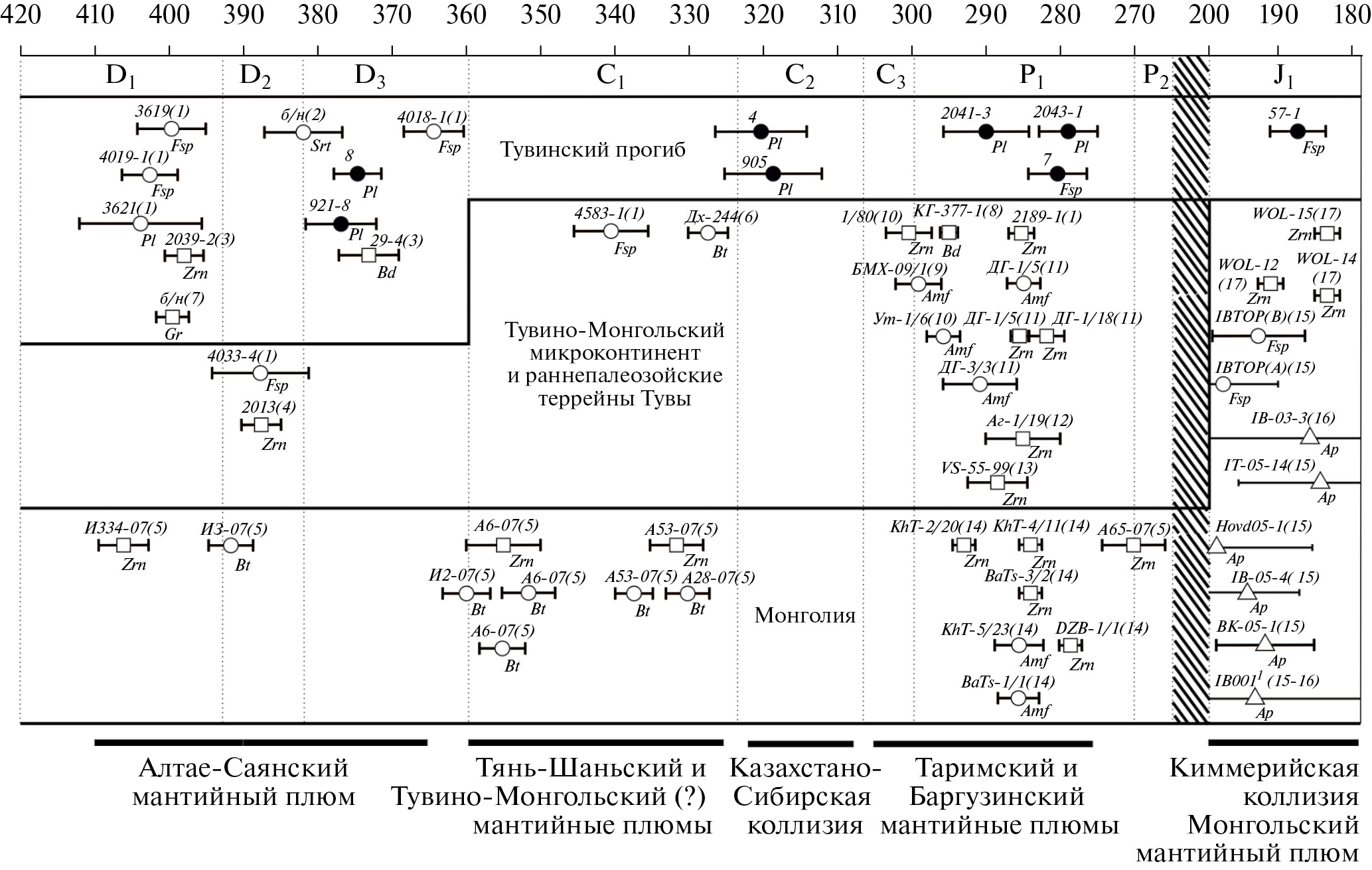 Дальнейшее постколлизионное развитие Тувинского сегмента ЦАОП связано с полихронным внутриплитным магматизмом, широко развитым в пределах Тувино-Монгольского микроконтинента [34, 41, 46, 47].