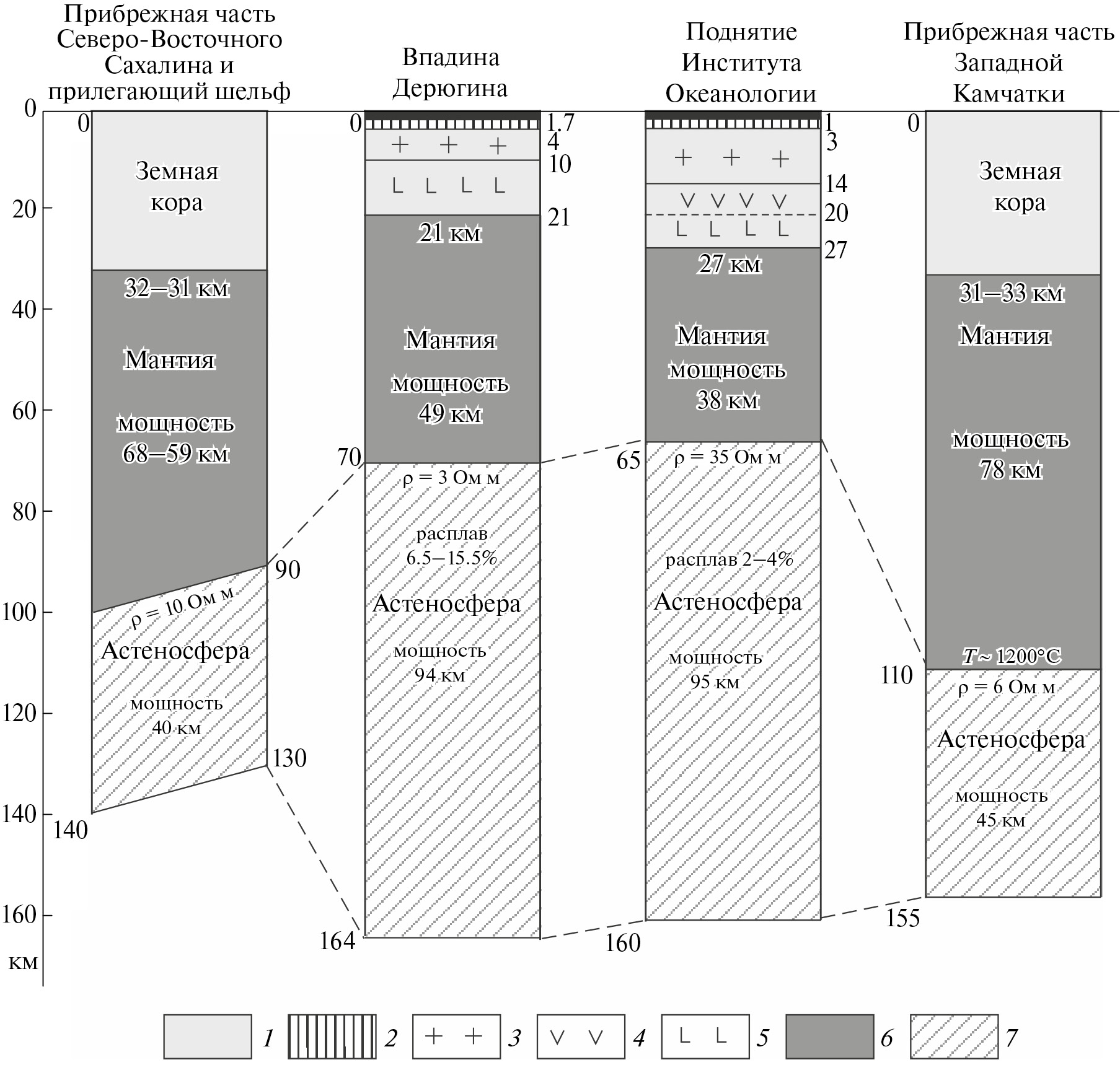 Мощность литосферы составляет 100 км, что вдвое меньше, чем в краевой части примыкающего Евразийского континента [89]. Электропроводимость в пределах поднятия Института Океанологии в южной части Охотоморского блока определяет мощность литосферы в 65 км, а во впадине Дерюгина – 70 км [66] (рис. 3).