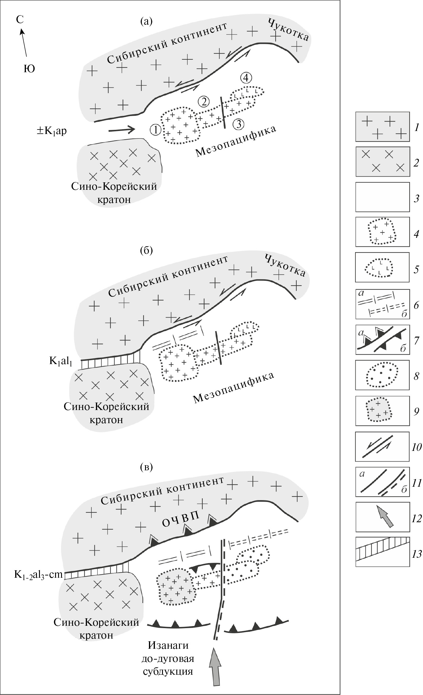 До-позднемеловой фундамент северо-восточной части Евразийского континента включает ‒ на западе Сибирский кратон c многочисленными тектоническими провинциями, расположенным восточнее Верхоянским террейном пассивной окраины, далее ‒ на восток Колымо-Омолонский супертеррейн с крупны кратонными террейнами типа Омолонского массива и, далее восточнее ‒ отделенный Южно-Анюйским швом террейн пассивной окраины Чукотского микроконтинента [7, 12, 58, 64, 71, 116],