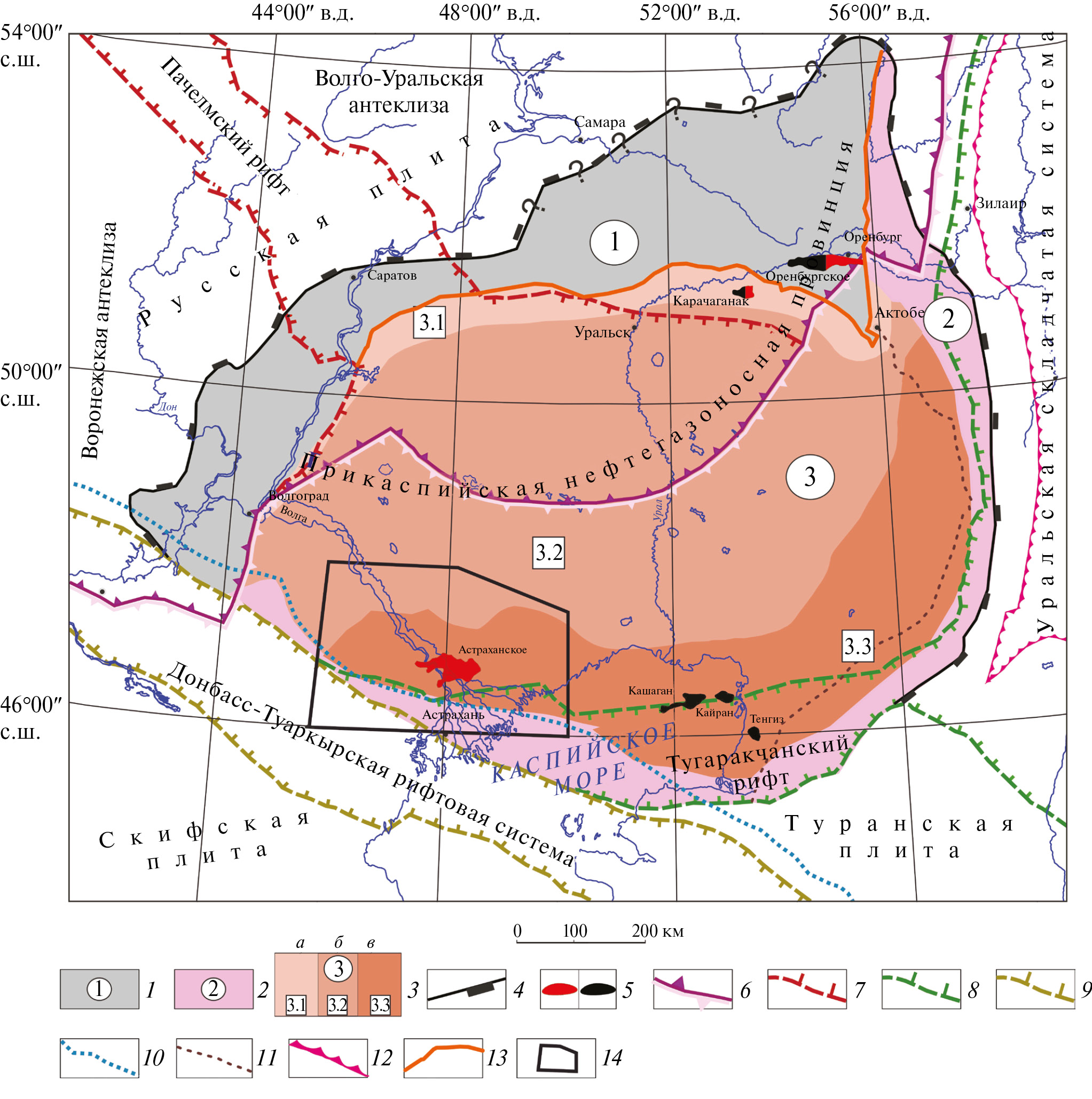 1–4 − элементы нефтегазогеологического районирования высоких рангов: 1 − Северо-Западная субпровинция; 2 − Юго-Восточная субпровинция; 3 − Центрально-Прикаспийская субпровинция: а − Северо-Западная прибортовая нефтегазоносная область, б − Сарпинско-Хобдинская нефтегазоносная область, б − Астраханско-Актюбинская нефтегазоносная область; 4 − граница Прикаспийской нефтегазоносной провинции (также является границей распространения пермской соленосной формации); 5 – месторождения: а – газовые, б – нефтяные; границы структурно-тектонических подразделений земной коры высоких рангов (6–13): 6 − юго-восточная граница между древней Восточно-Европейской и молодой Центрально-Евразийской платформами, 7‒9 − граничные разломы: 7 ‒ Пачелмского рифта рифейского возраста, 8 − Тугаракчанского рифта раннепалеозойского возраста, 9 − Донбасс-Туаркырского рифта позднедевонского возраста, 10‒11 − фронт складчатых деформаций: 10 ‒ раннемезозойских Донбасс-Туаркырской складчатой системы, 11 − предкугнгурских Уральской складчатой системы, 12 − главная Уральская сутура, 13 – пермский карбонатный уступ; 14 – контур района исследования