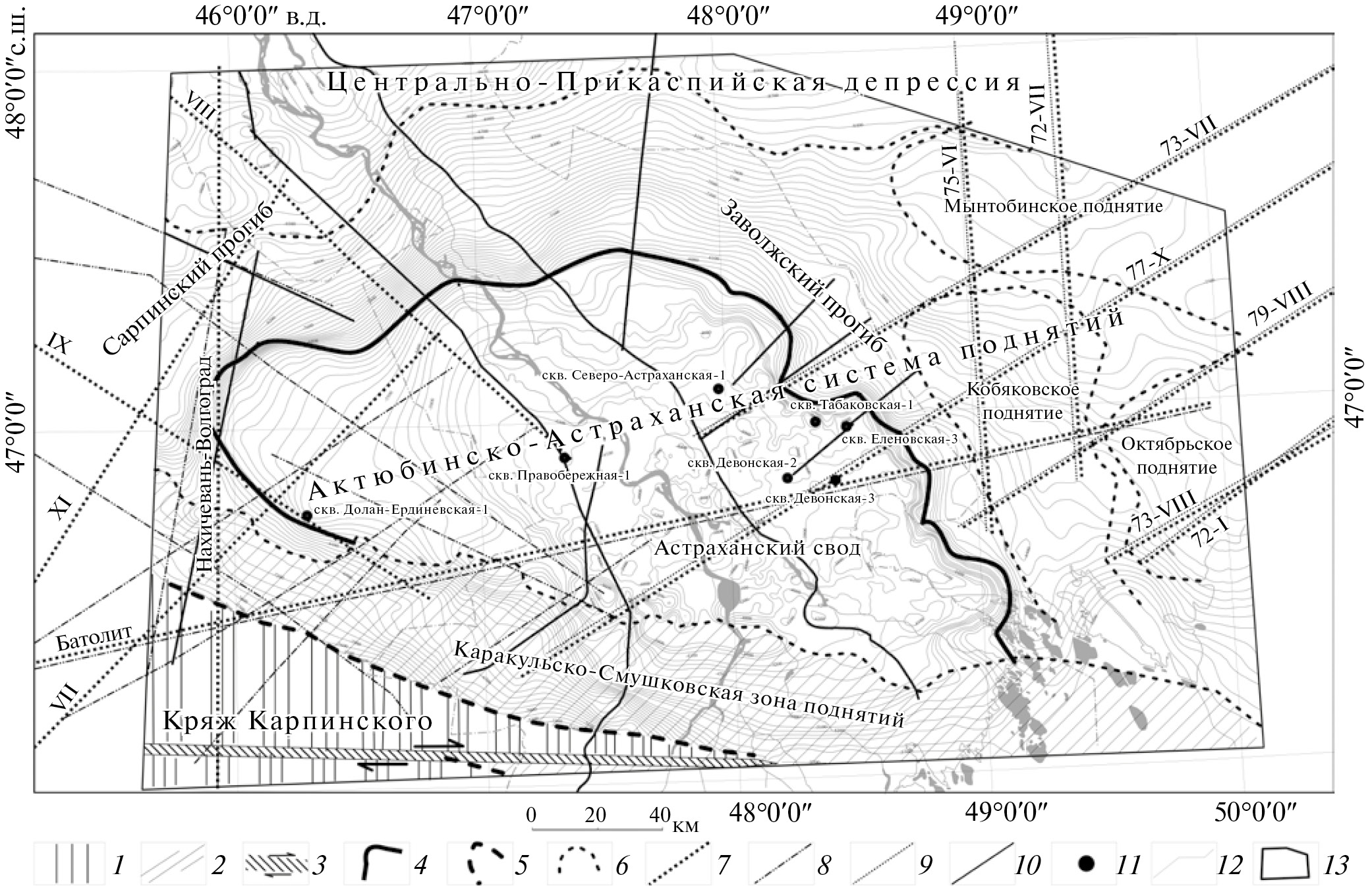 1 – кряж Карпинского; 2 – Каракульско-Смушковская зона поднятий; 3 – Южно-Эмбинский сдвиг; 4‒6 – геологическая граница: 4 ‒ Астраханской внутрибассейновой карбонатной платформы (D1p‒С2b1), 5 – кряжа Карпинского, 6 – тектонических элементов; 7–10 – сейсмические профили, использованные для построения новой модели, их названия и номера: 7 – КМПВ, 8 – МОГТ, 9 – МОГТ и КМПВ, 10 – повторно обработанные профили МОГТ; 11 – глубокие скважины; 12– изолинии по отражающему горизонту П3; 13 – контур района исследований