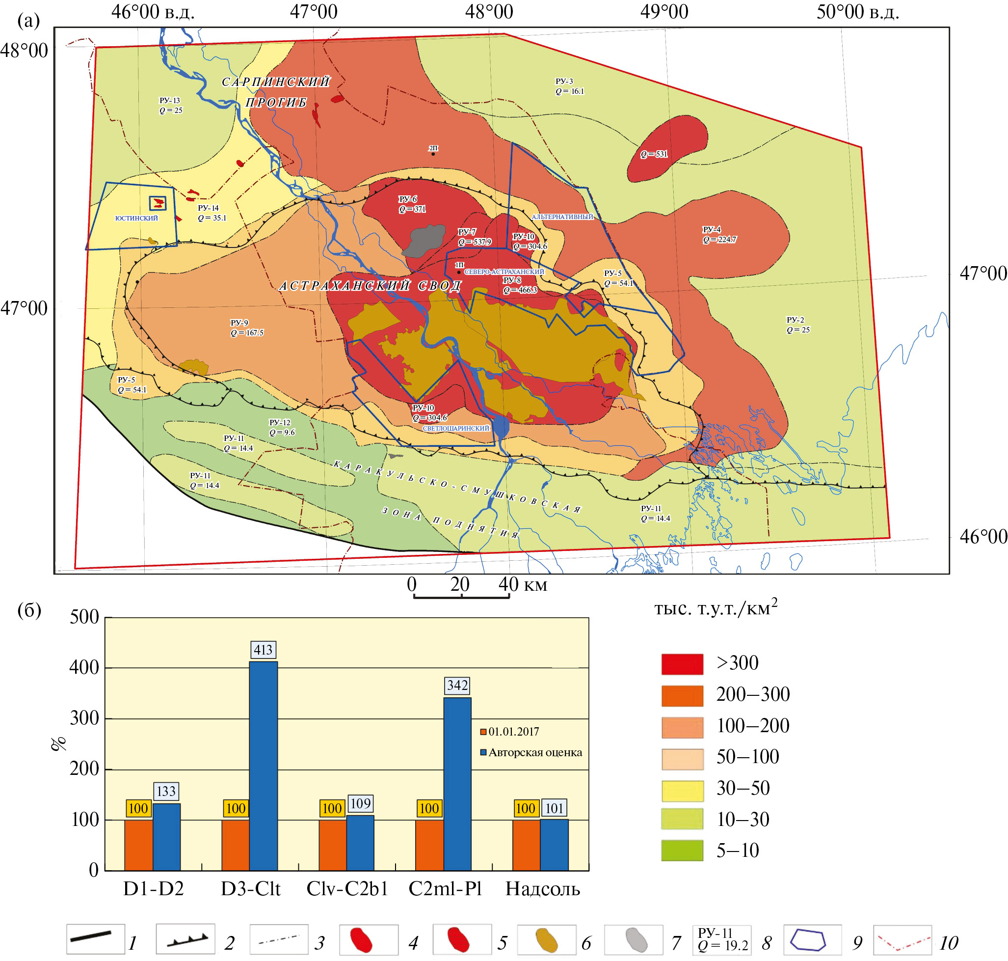 ‒ количественная оценка ресурсов углеводородов для ряда перспективных объектов (Тамбовского, Володарского, Заволжского, Кашалакского и др.) в обрамлении Астраханской платформы, а также непосредственно в пределах свода раннедевонско‒башкирской Астраханской карбонатной платформы, где расположены открытые в отложениях визейско‒нижнебашкирского комплекса месторождения, а также получены притоки из кроющих ее нижнепермских отложений.