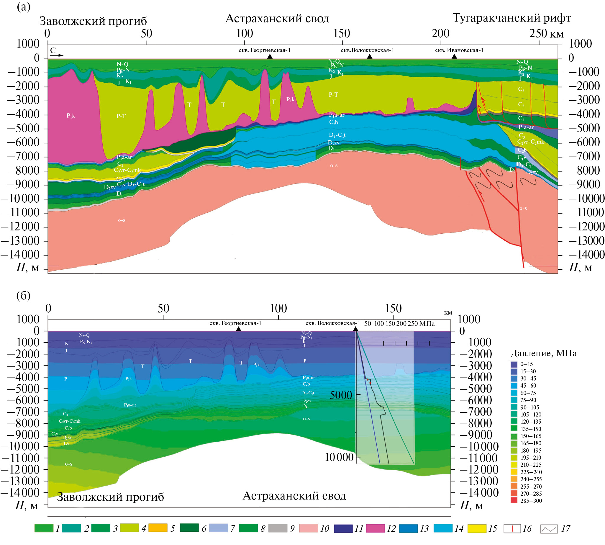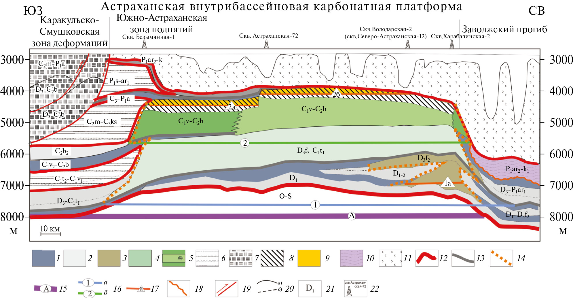 1 – внешний контур девонско‒раннебашкирской внутрибассейновой карбонатной платформы; гидродинамические замки́ (2–5): 2 – визейско‒нижнебашкирского нефтегазоносного комплекса, 3‒4 – литологически экранированной ловушки клинотемы: 3 ‒ нижней, 4 – верхней, 5 – ловушки сводового типа (Северо-Астраханская), приуроченной к дезинтегрированной толще в кровле ундоформы визейско‒раннебашкирской карбонатной платформы; 6 – граница кряжа Карпинского; 7 – Южно-Эмбинский сдвиг; 8 – Каракульско-Смушковская зона; 9 – граница Каракульско-Смушковской зоны; 10–12 – литолого-фациальные зоны, связанные с морфоструктурными элементами визейско‒раннебашкирской карбонатной платформы: 10 – ундотема; 11 – клинотема; 12 – фондотема; 13 – профили МОГТ (переобработанные); 14 – положение профиля, по которому построена модель визейско‒башкирского НГК (см. рис. 8); 15 – изогипсы по ОГ П2 (кровля карбонатов С2b); 16 – сверхглубокие скважины; 17 – административные границы