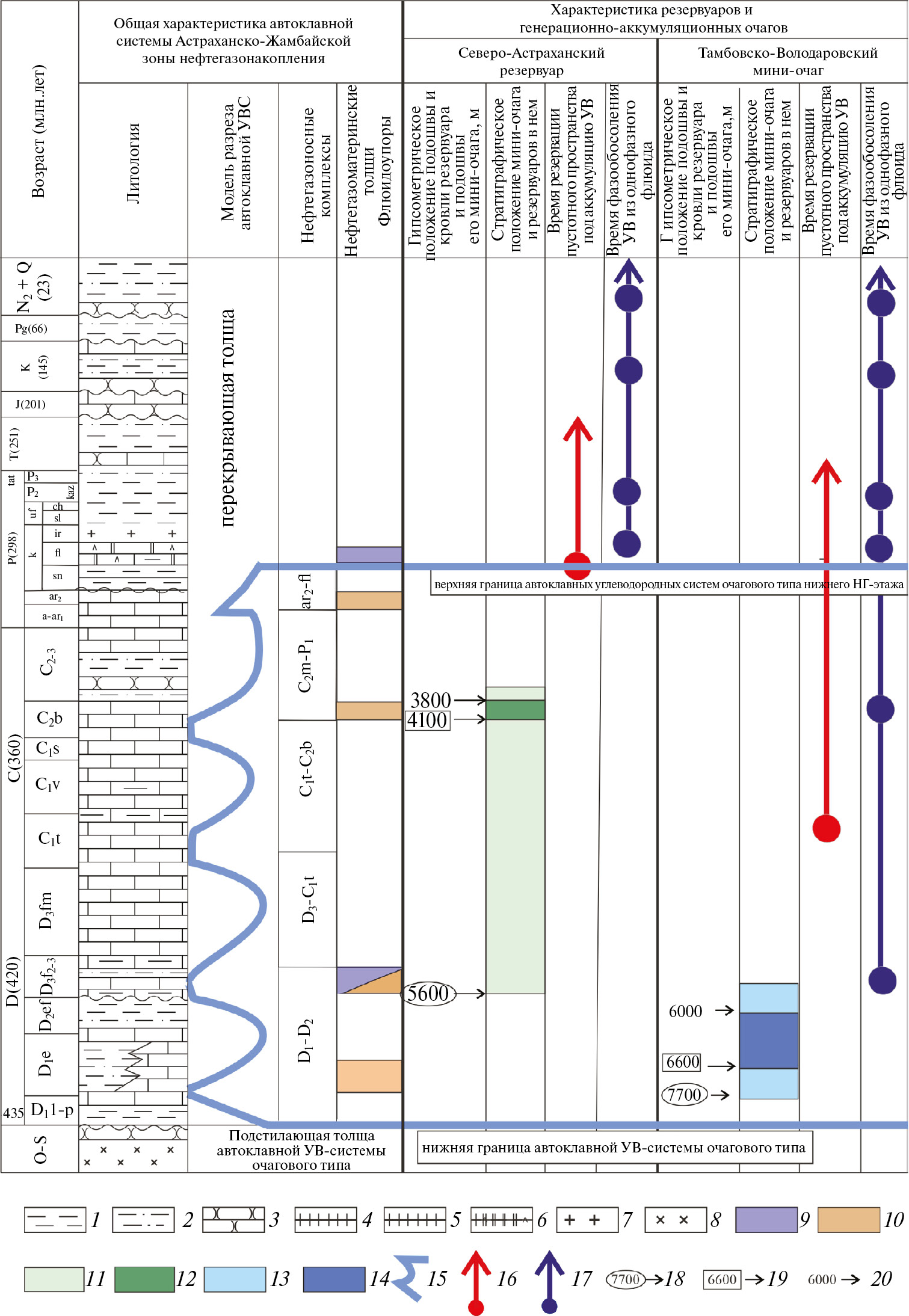 1–8 – литологический состав разреза: 1– аргиллит, 2 – алевролит, 3 – песчаник, 4 – известняк, 5 – доломит, 6 – глинистый известняк и ангидрит, 7 – соль, 8 – вулканогенно-терригенные породы нижнего палеозоя и консолидированной коры; 9 – региональные и локальные покрышки, 10 – нефтегазоматеринские толщи, 11 – генерационно-аккумуляционные мини-очаги франско-башкирского комплекса; 12‒13 – резервуары комплекса: 12 ‒ франско‒башкирского, 13 – нижне-среднедевонского; 14 – генерационно-аккумуляционные мини-очаги нижне-среднедевонского комплекса; 15 – граница автоклавной системы; 16 – время резервации пустотного пространства резервуара; 17 – время фазо-обособления свободных углеводородов из однофазного флюида и критические точки формирования месторождения; 18–20 ‒ гипсометрические отметки гидродинамического замка: 18 – мини-очага, 19 – резервуара, 20 – кровля резервуара