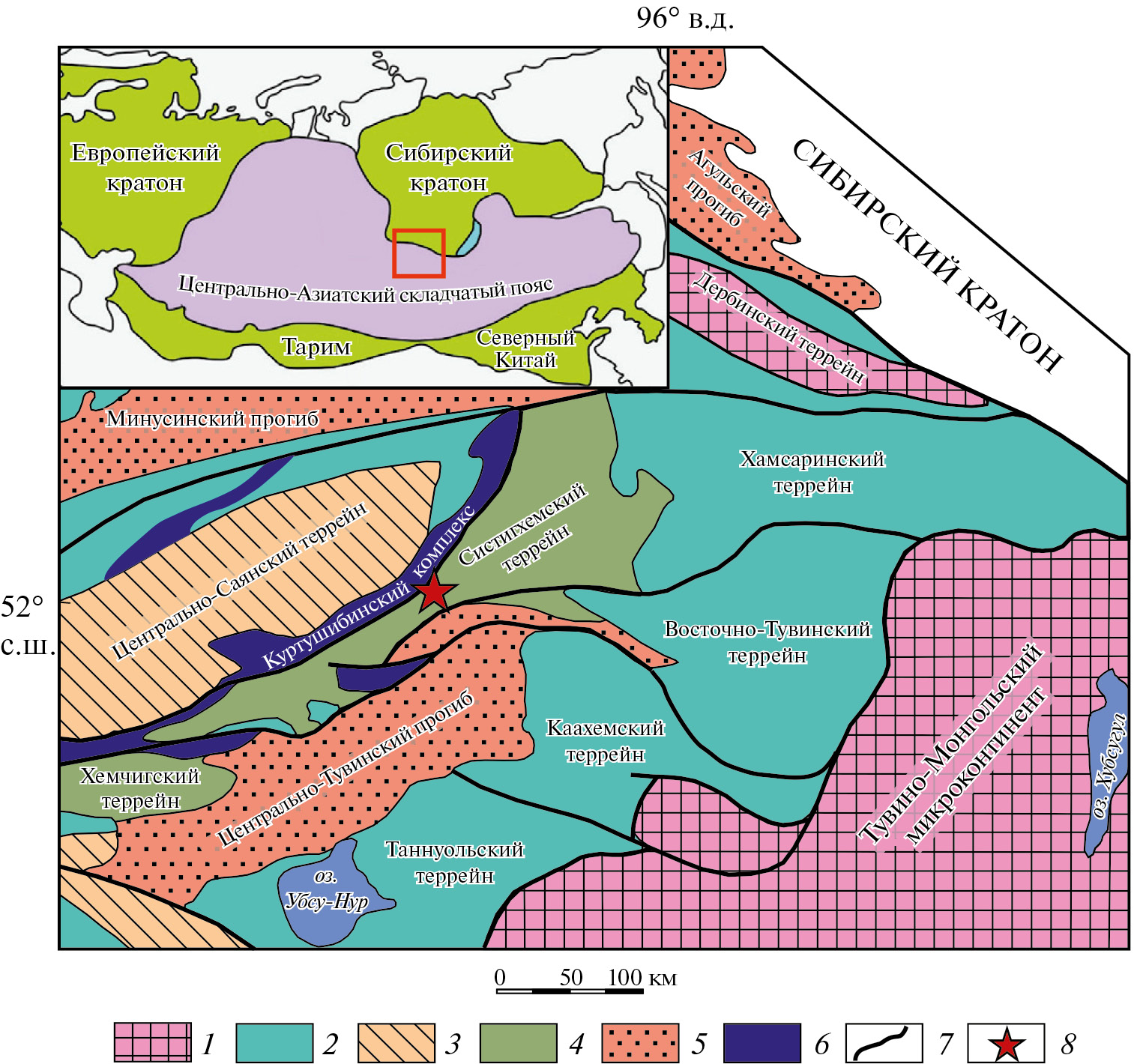 4‒6 – комплексы: 4 ‒ раннепалеозойских бассейнов, 5 – позднепалеозойских бассейнов, 6 – офиолитовые; 7 – разломные нарушения; 8 – регион исследования