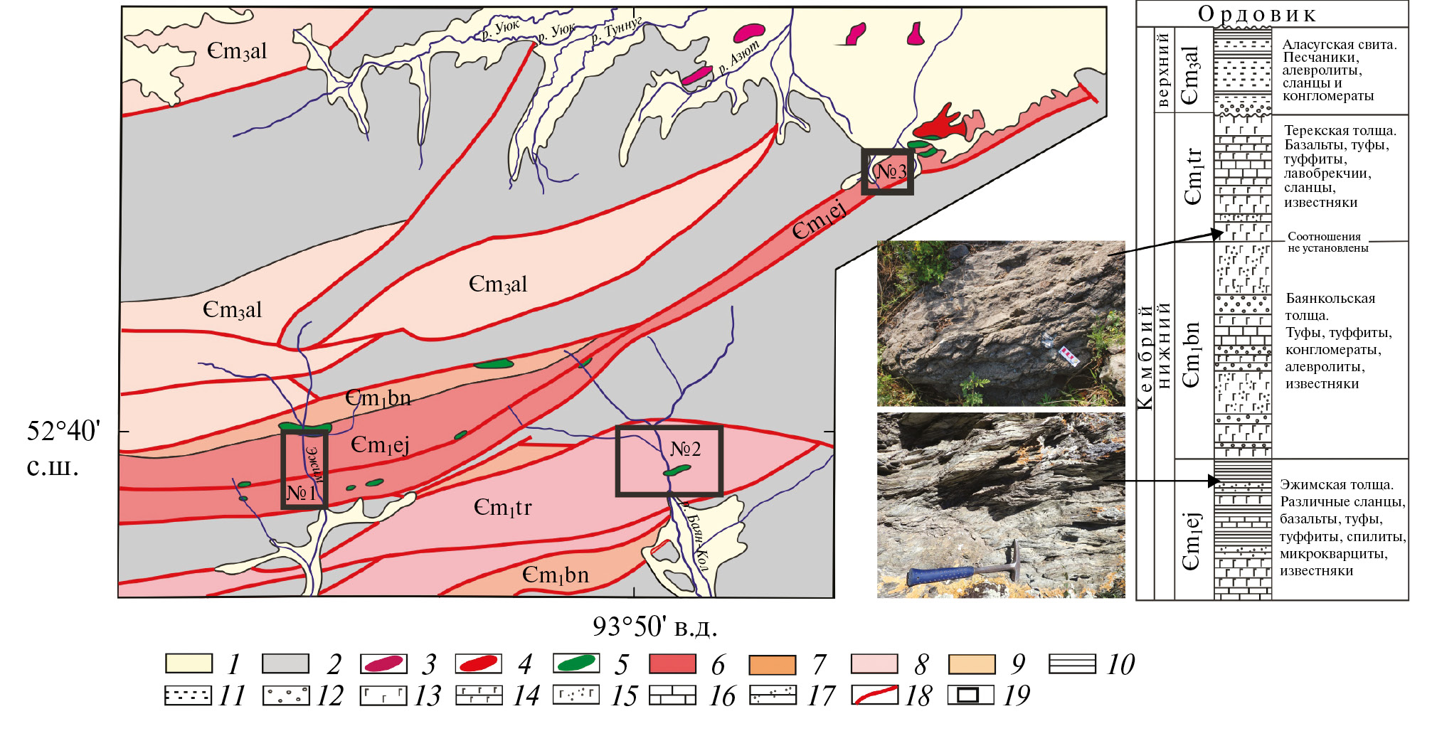 1 – четвертичные отложения; 2 –ордовикско–силурийские и девонские комплексы Хемчикско-Систигхемского прогиба; 3 – среднедевонские гранодиориты, граниты, гранит-порфиры; 4 – среднекембрийские диориты; 5 – среднекембрийские серпентинизированные перидотиты, пироксениты, габбро; 6–9 – свиты: 6 – эжимская, 7 – баянкольская, 8 – терекская, 9 – аласугская; 10 – сланцы; 11 – песчаники; 12 – конгломераты; 13 – базальты; 14 – туфы; 15 – туффиты; 16 – известняки; 17 – микрокварциты; 18 – тектонические нарушения; 19 – участки отбора проб