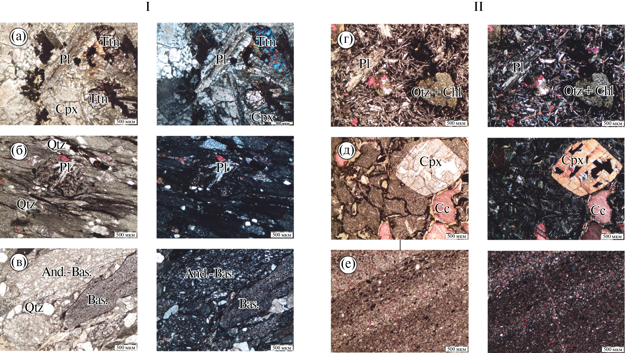 (г)‒(е) ‒ породы терекской свиты: (г) ‒ миндалекаменный базальтовый порфирит (проба TV-28), (д) ‒ базальтовый порфирит (проба TV-41), (е) – туф основного состава (проба TV-36)