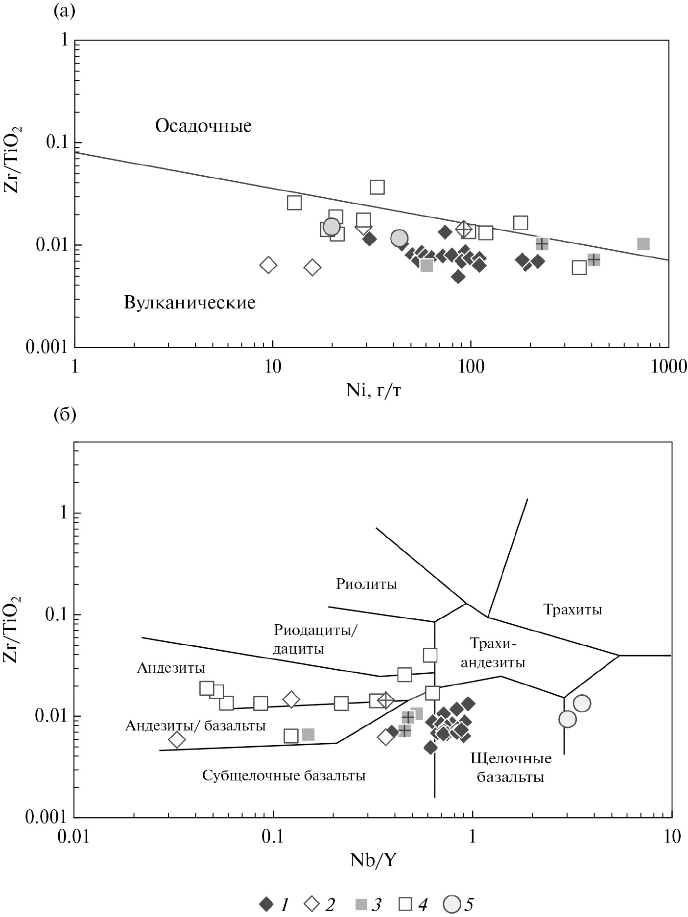 Рис. 4. Классификационные диаграммы (а) Ni-Zr/TiO2 (по [49]) и (б) Nb/Y-Zr/TiO2 (по [48]) для вулканитов терекской и эжимской толщ.