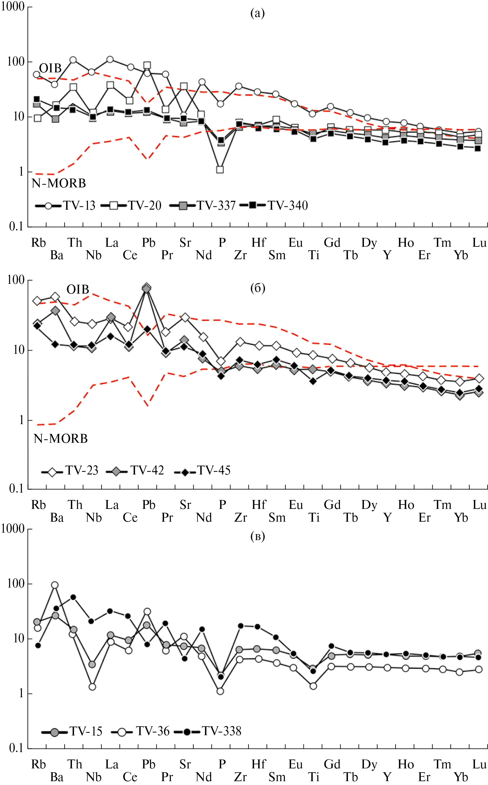(а)‒(в) ‒ породы эжимской свиты: (а) ‒ долерит (проба TV-13), (б) ‒ туф основного-среднего состава (проба TV-16), (в) ‒ туффит (проба TV-340);