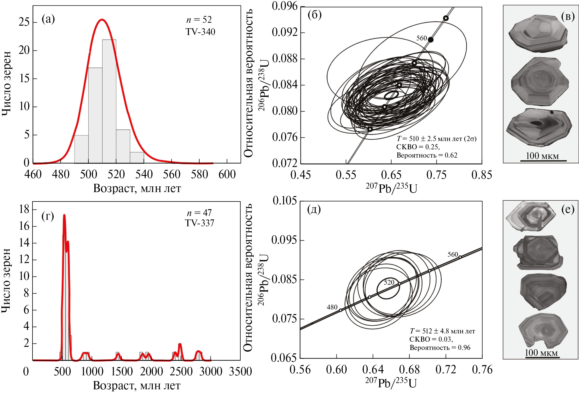 U‒Pb датирование цирконов выполнено в ЦКП ИГМ СО РАН (г. Новосибирск) (проба TV-48) и ЦКП “Геодинамика и геохронология” ИЗК СО РАН (г. Иркутск) (пробы TV-337 иTV-340).