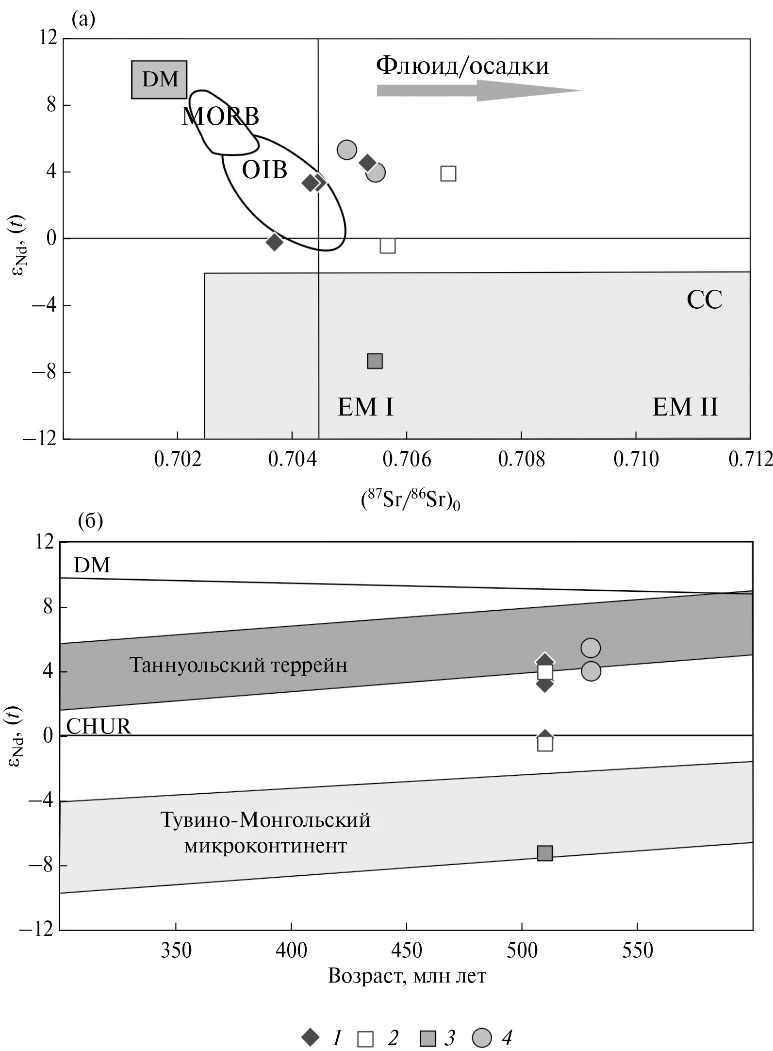 Положение исследованных составов на диаграммах в полях базальтов континентальных и задуговых обстановок, геохимические и изотопные особенности состава вулканитов позволяют предполагать, что формирование бассейна происходило на коре переходного типа (рис. 11, а, б).