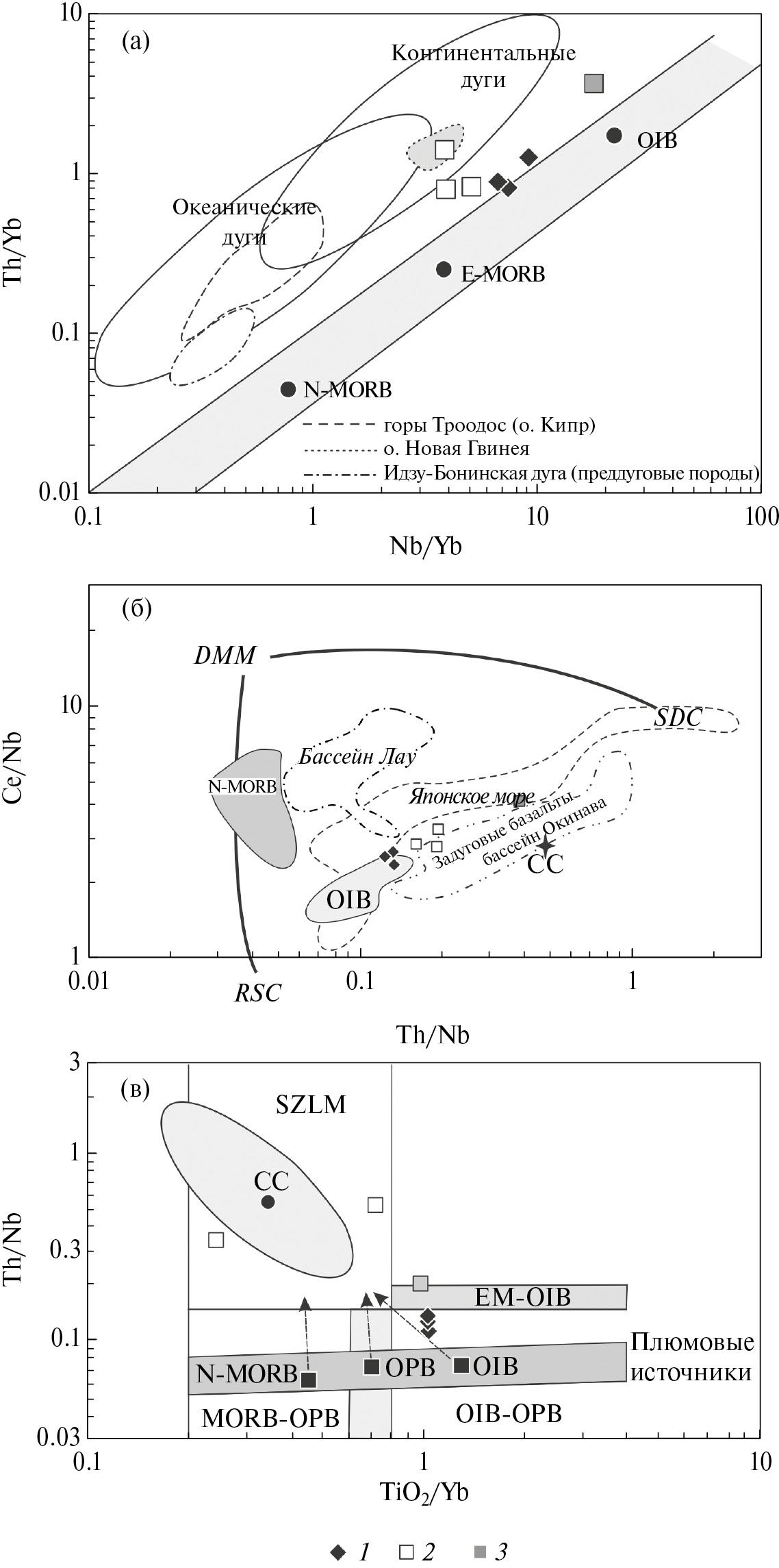 Составы N-MORB, E-MORB и OIB (по [45]); обозначены поля (пунктир): Японского моря, бассейна Лау и Окинава BABB (по [46]);