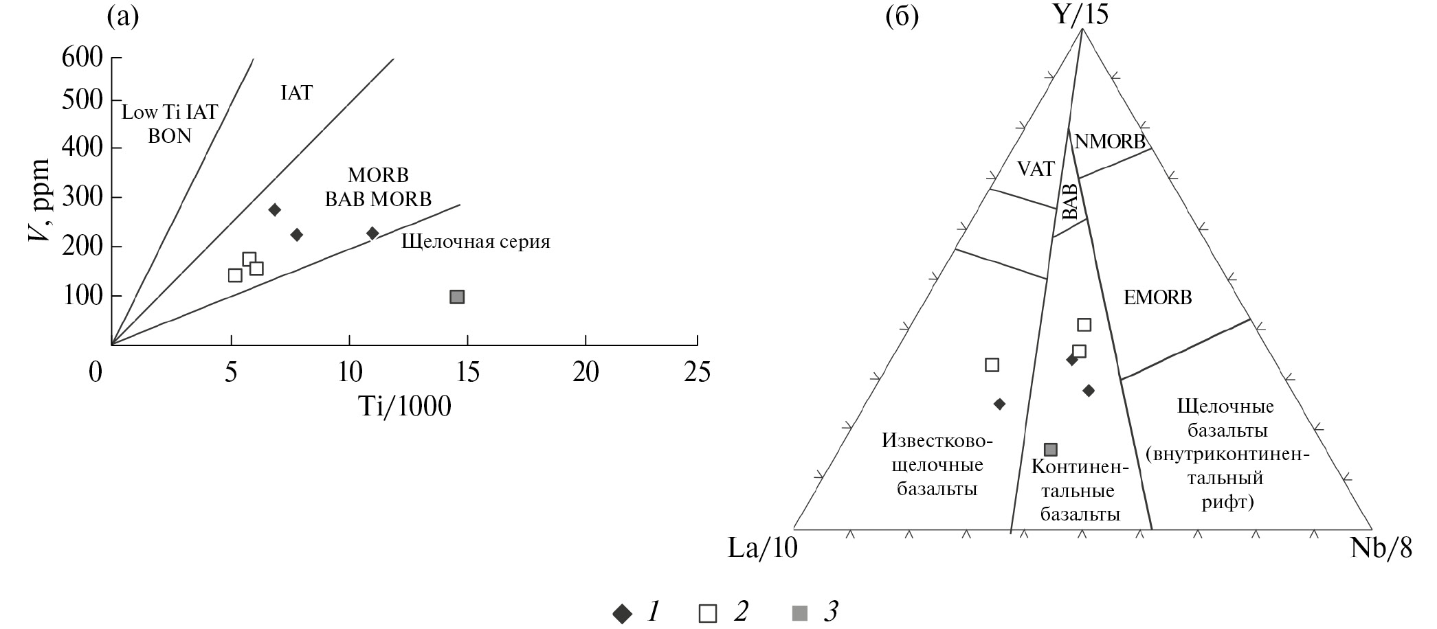 Рис. 11. Диаграммы (а) V-Ti/1000 (по [43]) и (б) Nb/8-Y/15-La/10 (по [27]) для метабазальтов терекской и эжимской свит Систигхемского террейна.