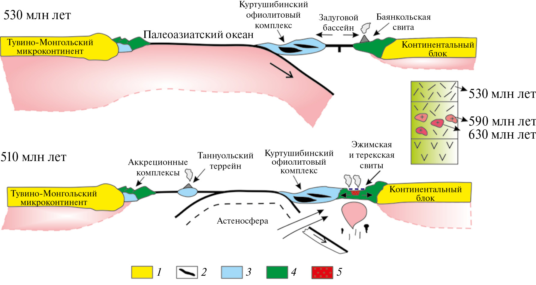 1–2 – кора: 1 – континентальная, 2 ‒ океаническая; 3 ‒ островная дуга; 4 ‒ аккреционно-субдукционный комплекс; 5 – отложения баянкольской свиты