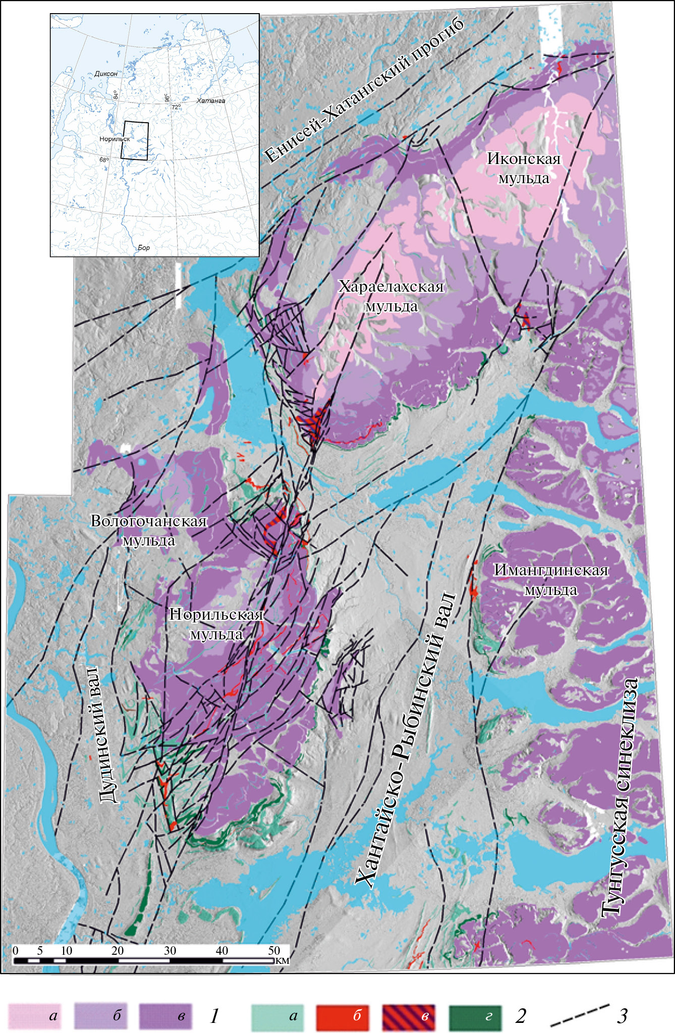 На северо-западе Сибирской платформы прежде всего выделяется структура первого порядка – Тунгусская синеклиза, северо-западная окраина которой располагается вдоль юго-восточной границы Норильского района [36, 50, 53, 54] (рис. 1).