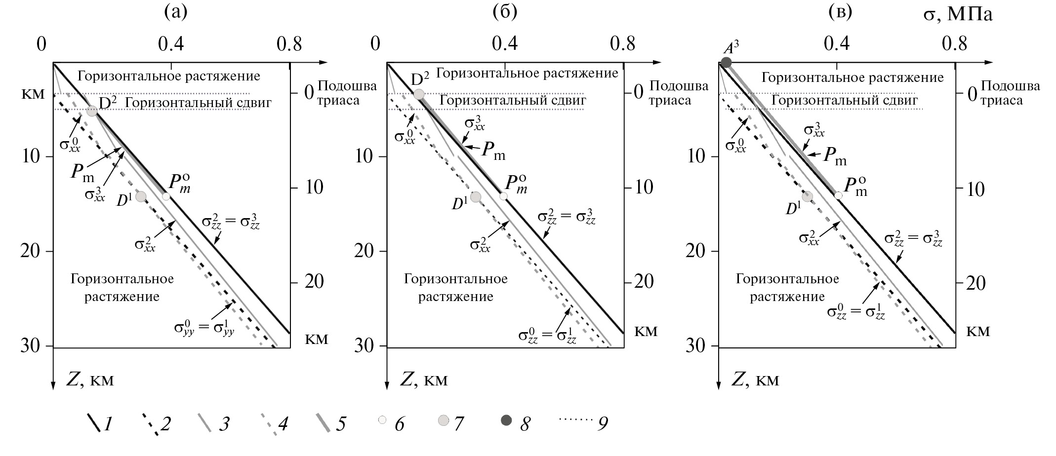 Эрозионные процессы, уменьшающие высоты рельефа для Хантайско-Рыбнинского вала на 3 км, способны повысить уровень горизонтального сжатия за счет остаточных напряжений сжатия пород, пришедших вверх с больших глубин [7, 38–41, 77]. Это приводит к тому, что в Хантайско-Рыбнинском вале на глубинах до 10–15 км такое повышение может достигать на 30–50 МПа, что должно было привести к смене геодинамического типа напряженного состояния на режим горизонтального сжатия (см. рис. 2, в).