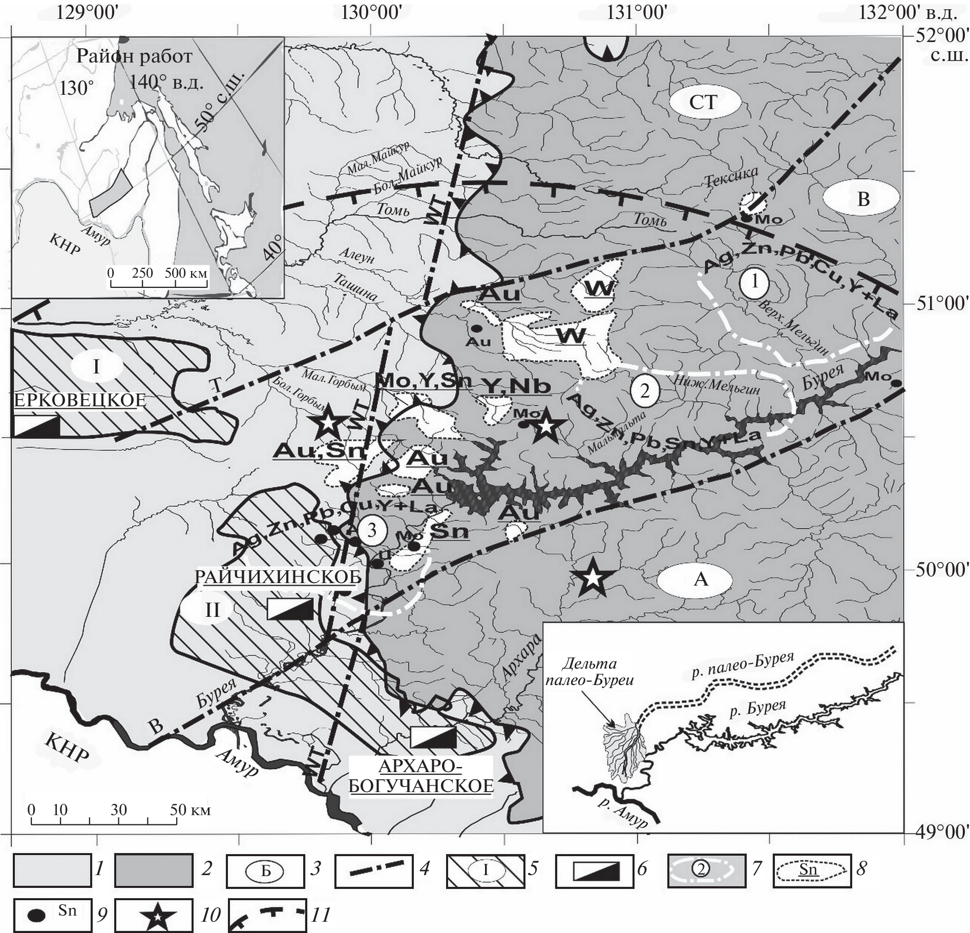Изучено формирование металлоносных угленосных отложений Райчихинского месторождения в зоне сопряжения питающих провинций Бурейского поднятия и областей угленакопления Зейско-Буреинского осадочного бассейна. Установлено, что оно происходило в условиях последовательных процессов извлечения рудных компонентов из кор выветривания Бурейского поднятия, транспортировки и разгрузки их в палео-дельте р. Бурея. Эти процессы протекали синхронно с вулканической деятельностью в Сихотэ-Алинском орогенном поясе, с которой связан привнос вулканического пепла. Сопряженность этих событий позволила выделить два типа обогащения редкоземельных элементов и иттрия (REY) райчихинских углей: терригенный – с поступлением REY поверхностными водами и комбинированный терригенно-вулканогенный, связанный с осыпанием и выщелачиванием кислых и щелочных вулканических пеплов. В углях и продуктах их сгорания преобладают лантаноиды цериевой группы. Наибольшая доля REY содержится в золе-уноса (0.11% от общей массы). Механизмы накопления рудных компонентов на стадии торфяной залежи рассмотрены с позиций локализации рудных микрокомпонентов в виде кластогенно-минеральных форм и в условиях взаимодействия рудных растворов с органической средой торфяников. Проведена оценка качества REY, выделены наиболее обогащенные участки пласта “Верхний”. Перспективы извлечения из угля лантаноидов рассмотрены с позиции возможности вовлечения в этот процесс также целого ряда редких, цветных и благородных металлов.