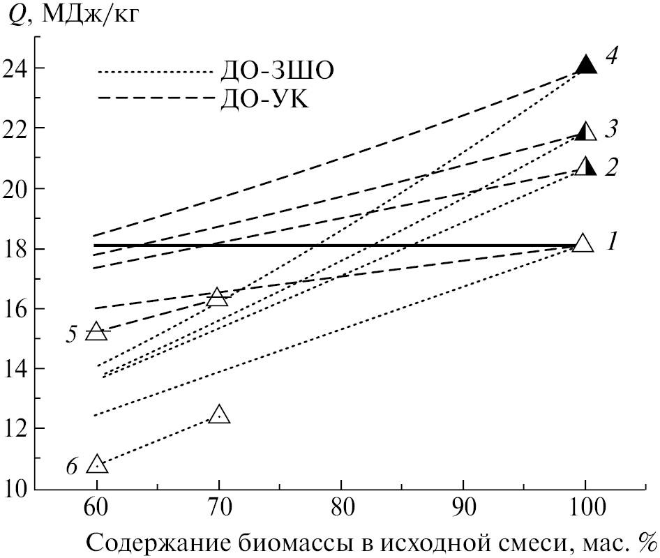 Из сказанного следует, что изменение характеристик смесевого топлива в процессе торрефикации обусловлено только изменением характеристик биомассы, входящей в его состав. Дополнительные исследования, проведенные с пеллетизированным смесевым топливом, показали, что в пределах нескольких процентов массовый выход как твердых, так и летучих продуктов торрефикации пропорционален доле биомассы в смеси и практически не зависит от вида углеродсодержащих отходов. На рис. 2 и 3 представлены зависимости теплоты сгорания исходных и торрефицированных при различных температурах смесевых топлив от их состава перед торрефикацией, определенные на основе данных элементного анализа. Для смесей ЗШО-ДО и УК-ДО с содержанием биомассы, равным 60 и 70%, на рис. 2 также приведены результаты калориметрических измерений. Отличие данных калориметрического анализа от данных, полученных по формуле Менделеева на основе измерений элементного состав, для смеси ЗШО-ДО не превосходит 13%, для смеси УК-ДО – 5% и уменьшается с ростом доли биомассы.